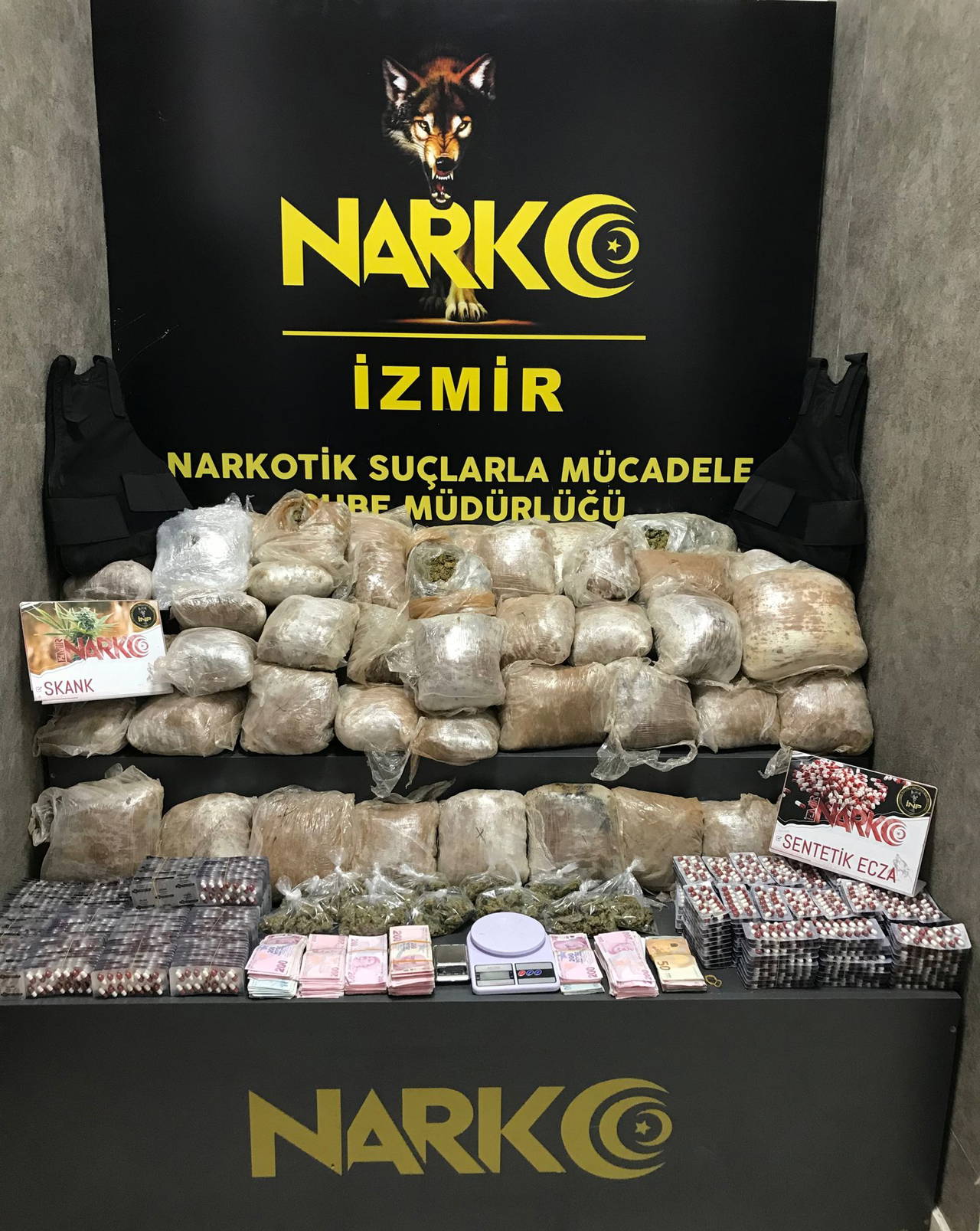 Operasyonda K.G., G.S.D., S.G., B.G. ve H.Y. adlı 5 şüpheli gözaltına alındı. Adreslerde yapılan detaylı aramada 35 kilo 67 gram skunk esrar, 15 bin 318 adet sentetik ecza, 2 hassas terazi ve suçtan elde edildiği değerlendirilen 153 bin TL ele geçirildi.