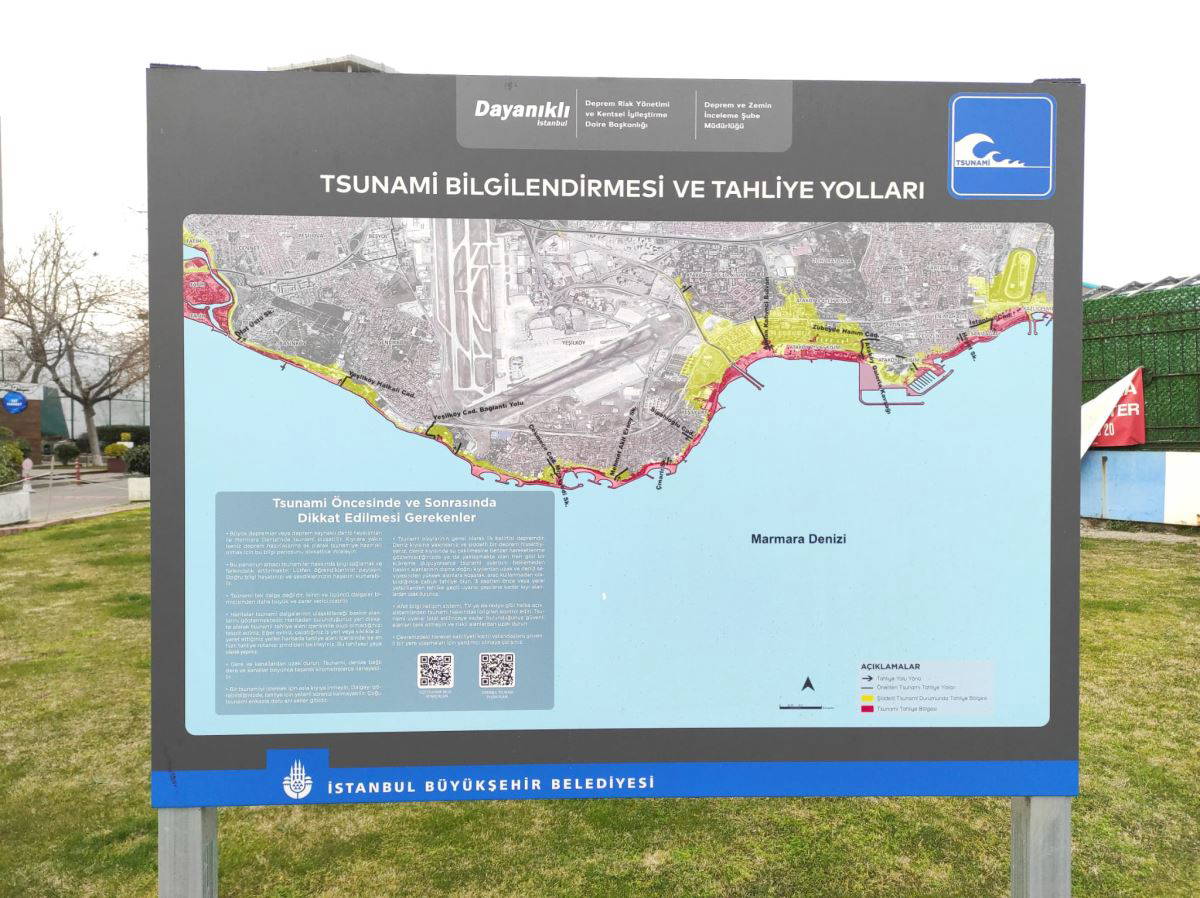 İstanbul Büyükşehir Belediyesi'nin Marmara Denizi ile kıyısında bulunan ilçelerde 'Tsunami Eylem Planı' kapsamında bilgilendirme panoları bulunuyor. İBB Deprem Risk Yönetimi ve Kentsel İyileştirme Dairesi'nin yürüttüğü çalışmada, 17 ilçede 131 tsunami bilgilendirme panosu yerleştirildi. Mühendislik Fakültesi, Genel Jeoloji Anabilim Dalı Başkanı Prof.Dr.Şamil Şen, "Tsunami için yapılan çalışmalar oldukça iyi. Bazı riskler için önlemler alınmış. Çeşitli bilgilendirme panoları var. Halkımızın bunlara dikkat etmesi lazım, deprem olduktan sonra sahile koşmaması gerek" dedi.
