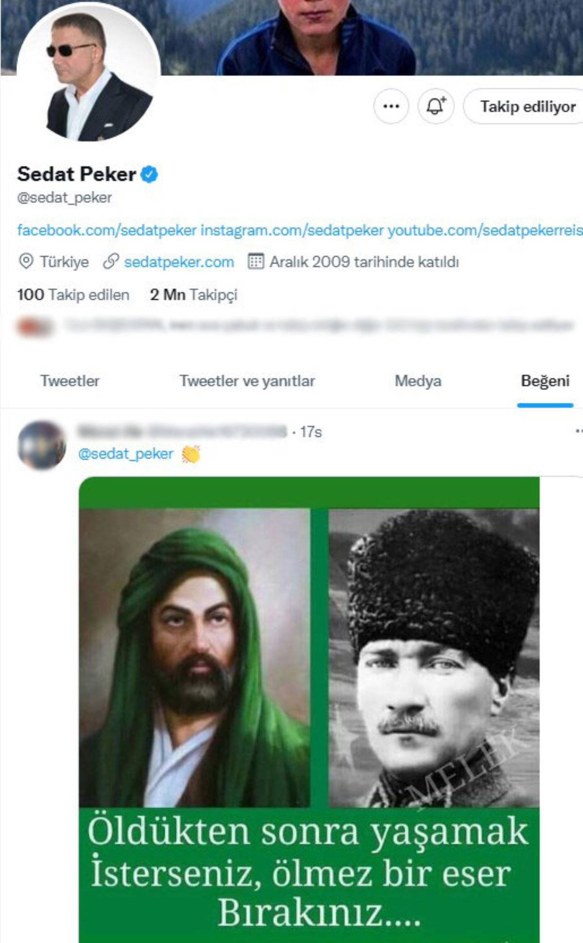 Peker'in Twitter hesabından, HZ. Ali ve Mustafa Kemal Atatürk'ün yer aldığı, "Öldükten sonra yaşamak isterseniz, ölmez bir eser bırakın" sözlerinin not düşüldüğü paylaşımı beğendiği görüldü.