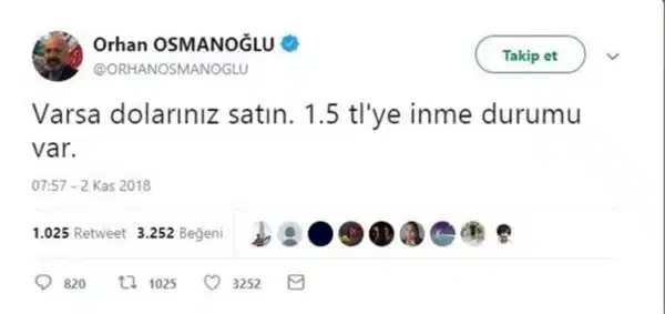 Osmalı padişahlarından 2. Abdülhamid'in torunlarından olduğunu öne süren Orhan Osmanoğlu da dolardaki durumu kabul etti. Osmanoğlu, 2018 yılında yaptığı 'Varsa dolarınız satın. 1.5 tl'ye inme durumu var' paylaşımını sildi.