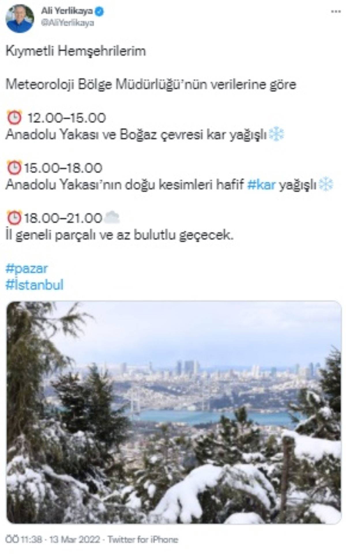 İstanbul Valisi Ali Yerlikaya, resmi Twitter hesabından yaptığı paylaşımda, kentte gün içerisinde beklenen kar yağışıyla ilgili uyarıda bulundu.