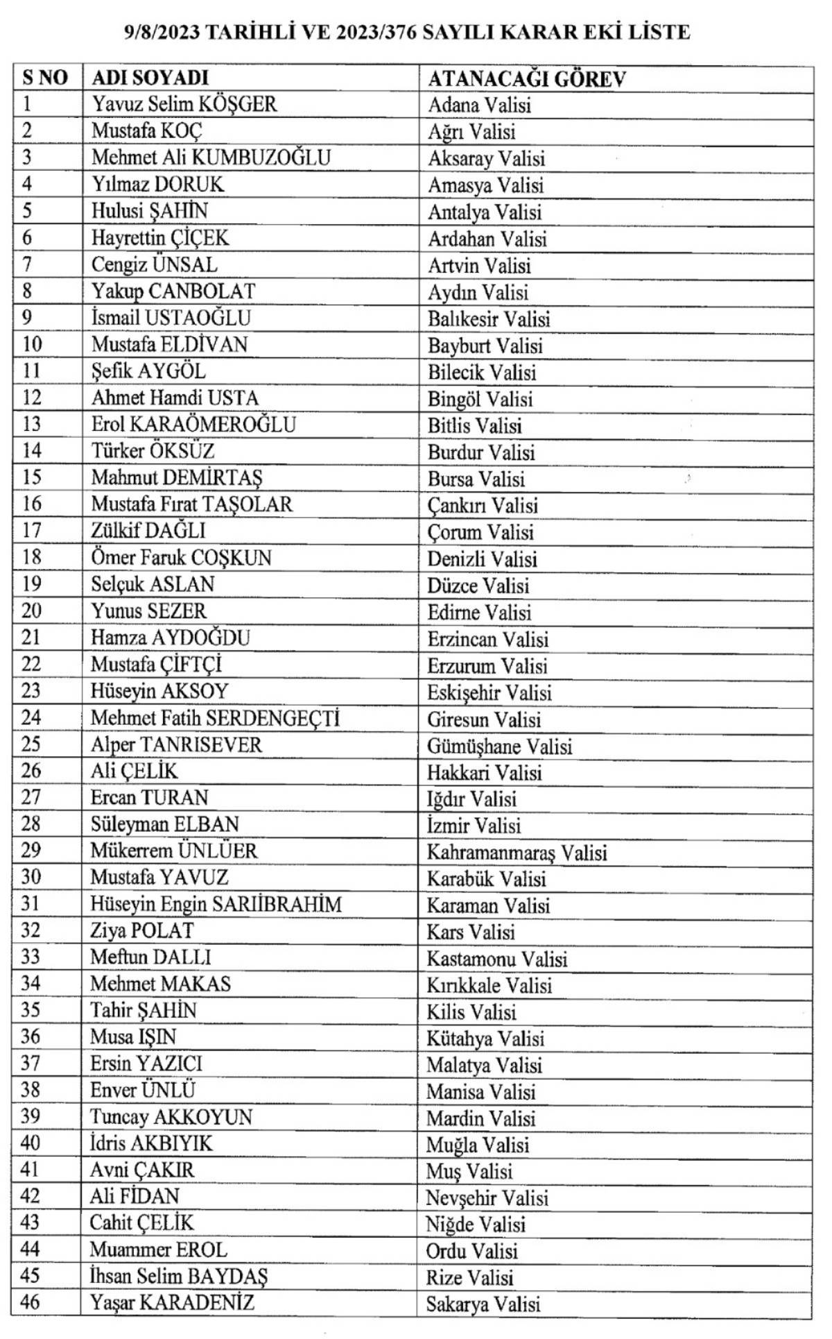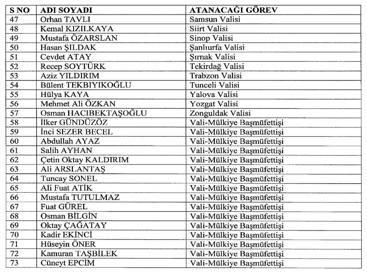 “Muş Valisi İlker Gündüzöz, Nevşehir Valisi İnci Sezer Becel, Çankırı Valisi Abdullah Ayaz, Şanlıurfa Valisi Salih Ayhan, Sakarya Valisi Çetin Oktay Kaldırım, Burdur Valisi Ali Arslantaş, Ordu Valisi Tuncay Sonel, Denizli Valisi Ali Fuat Atik, Zonguldak Valisi Mustafa Tutulmaz, Karabük Valisi Fuat Gürel, Şırnak Valisi Osman Bilgin, Bitlis Valisi Oktay Çağatay, Bingöl Valisi Kadir Ekinci, Ardahan Valisi Hüseyin Öner, Gümüşhane Valisi Kamuran Taşbilek, Bayburt Valisi Cüneyt Epcim.”