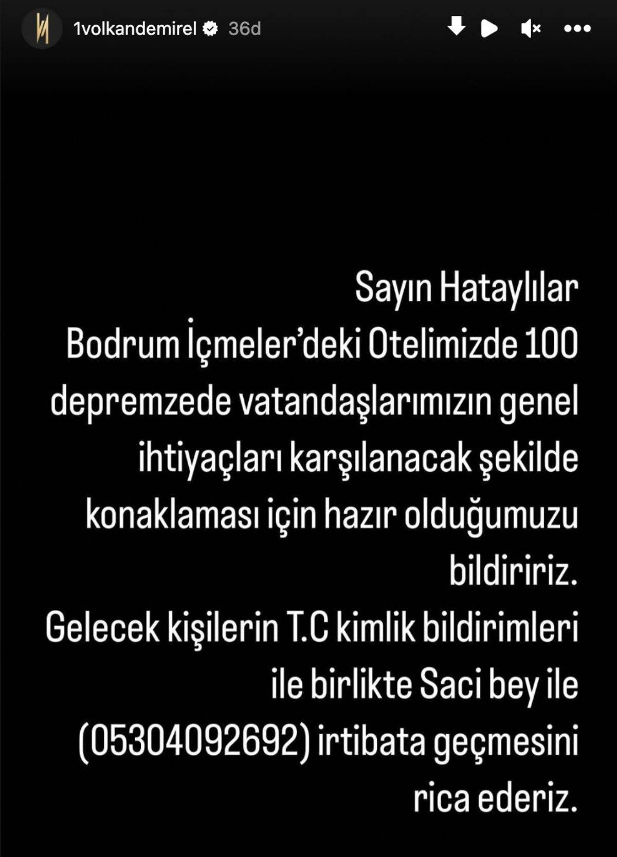 "Sayın Hataylılar, Bodrum İçmeler'deki otelimizde 100 depremzede vatandaşlarımızın genel ihtiyaçları karşılanacak şekilde konaklaması için hazır olduğumuzu bildiririz. Gelecek kişilerin T.C. kimlik bildirimleri ile birlikte Saci bey ile (05304092692) irtibata geçmesini rica ederiz."