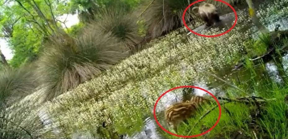 Bursa’da Karacabey Longoz Ormanlarındaki yaban domuzu sürüsündeki yavrular, göllerden su içerken fotokapana yakalandı.