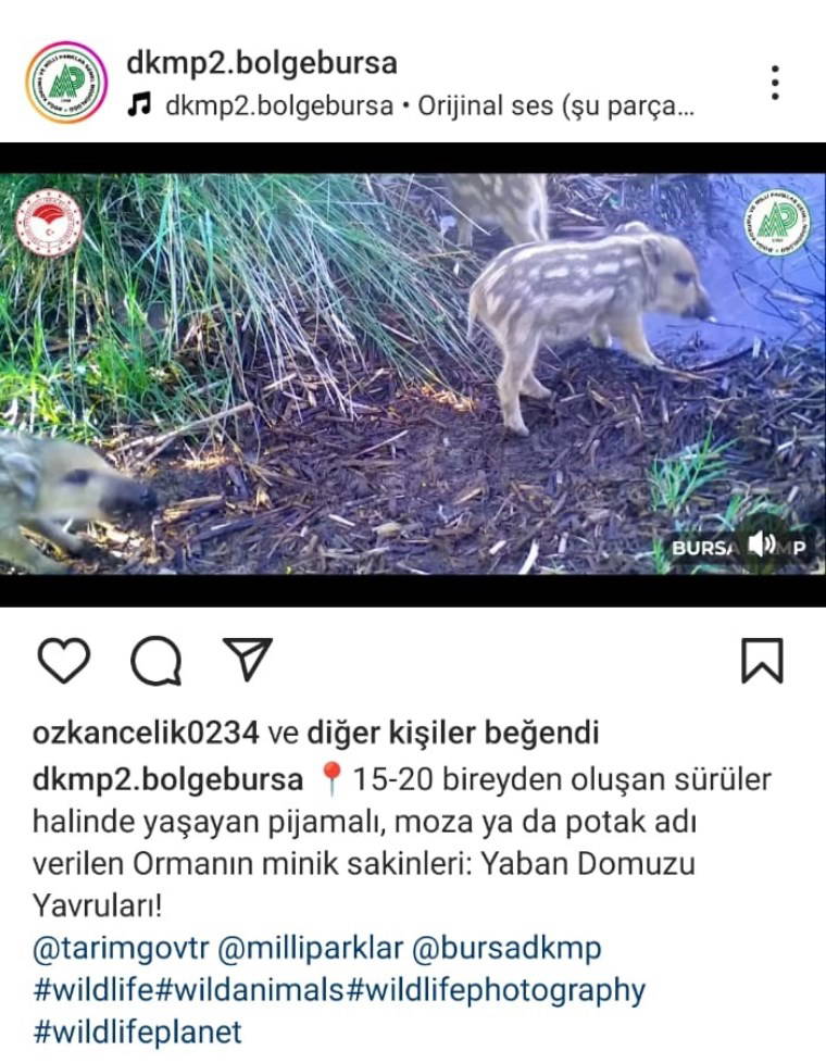 Karacabey Longoz Ormanları’nda görüntülenen yaban domuzu sürüsünde yavruların fotoğrafları Doğa Koruma ve Milli Parklar Müdürlüğü’nün sosyal medya hesabından, “15-20 bireyden oluşan sürüler halinde yaşayan pijamalı, moza ya da potak adı verilen ormanın minik sakinleri: Yaban Domuzu Yavruları!” ifadeleriyle paylaşıldı.