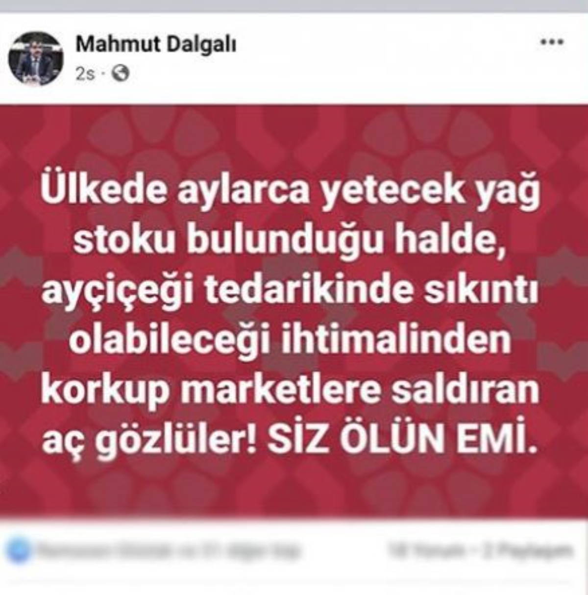 Halk TV’den Seyhan Avşar’ın haberine göre, Kırşehir Ticaret İl Müdürü Mahmut Dalgalı, “Ülkede aylarca yetecek yağ stoku bulunduğu halde, ayçiçeği tedarikinde sıkıntı olabileceği ihtimalinden korkup marketlere saldıran aç gözlüler! Siz ölün emi” demişti.