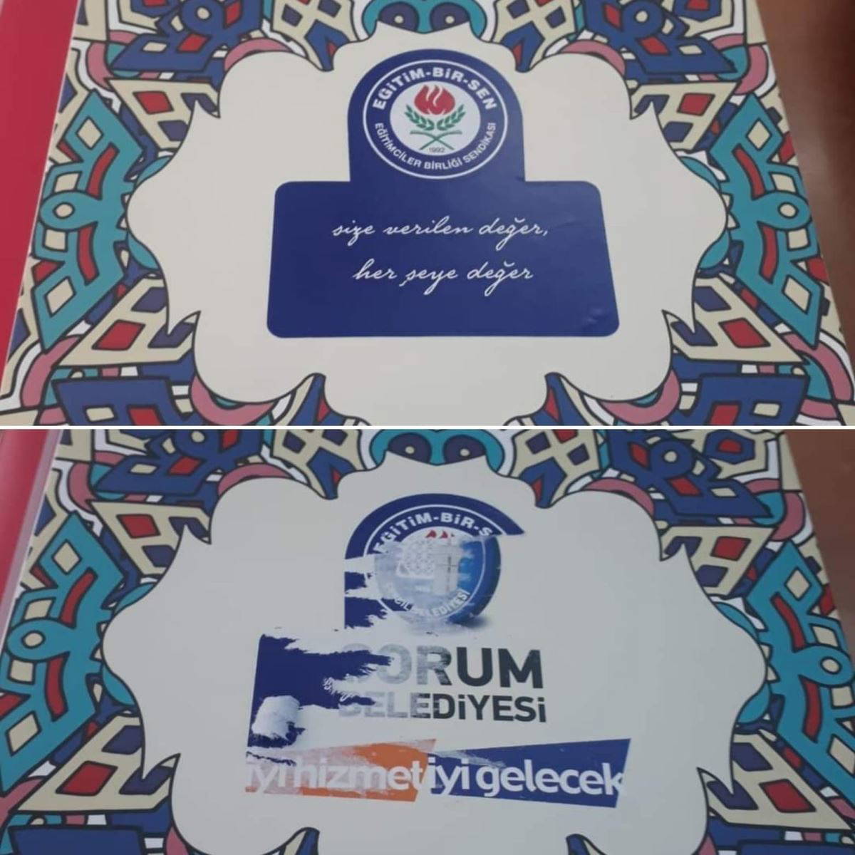 Çorum’da 24 Kasım Öğretmenler Günü’nde Memur Sen’e bağlı EğitimBir Sen Sendikası okullara hediye dağıttı. Sendikanın hediye olarak dağıttığı çikolataların paketlerindeki etiketler kaldırılınca gerçek ortaya çıktı. Etiketlerin altında, Çorum Belediyesi ve Türkiye Cumhuriyeti Aile ve Sosyal Hizmetler Bakanlığı amblemleri ortaya çıktı.