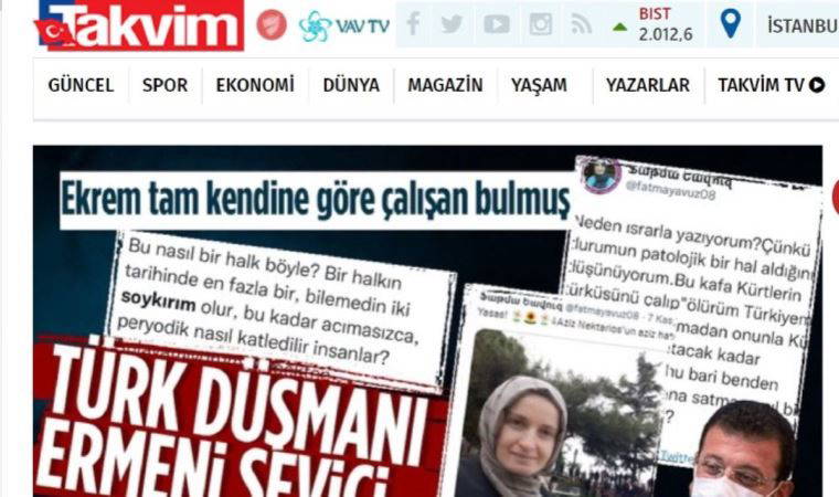 Yandaş Takvim, "Başörtülü çalışan olarak parlatılan İBB İnanç Masası çalışanı Ermeni asıllı Fatmaz Yavuz Atatürk'e ve Türk milletine hakaret etti. Türklerin soykırım yaptığı yalanına sarılan Yavuz, Ülkücüler için de 'hırsız' ithamlarında bulundu" spotuyla verdiği haberin görselinde "Ekrem tam kendine göre çalışan bulmuş" , "Türk düşmanı Ermeni sevici" gibi ırkçı ve şoven ifadelerle Fatma Yavuz'u hedef gösterdi.