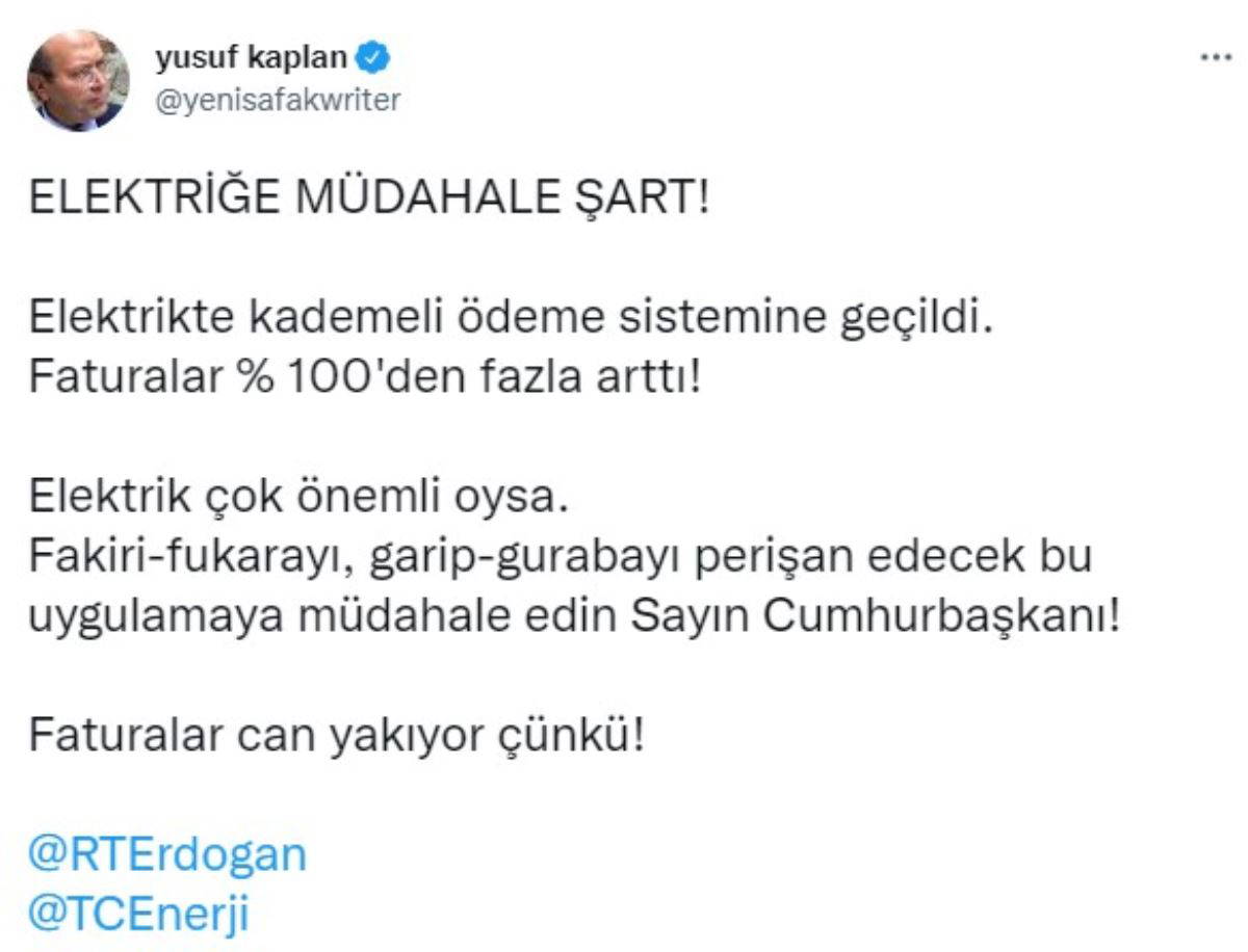 Twitter hesabından paylaşımda bulunan Kaplan, Cumhurbaşkanı Recep Tayyip Erdoğan'a seslendi. Elektirk faturlarındaki zamma tepki gösteren Kaplan, müdahalenin "şart olduğunu" belirtti.