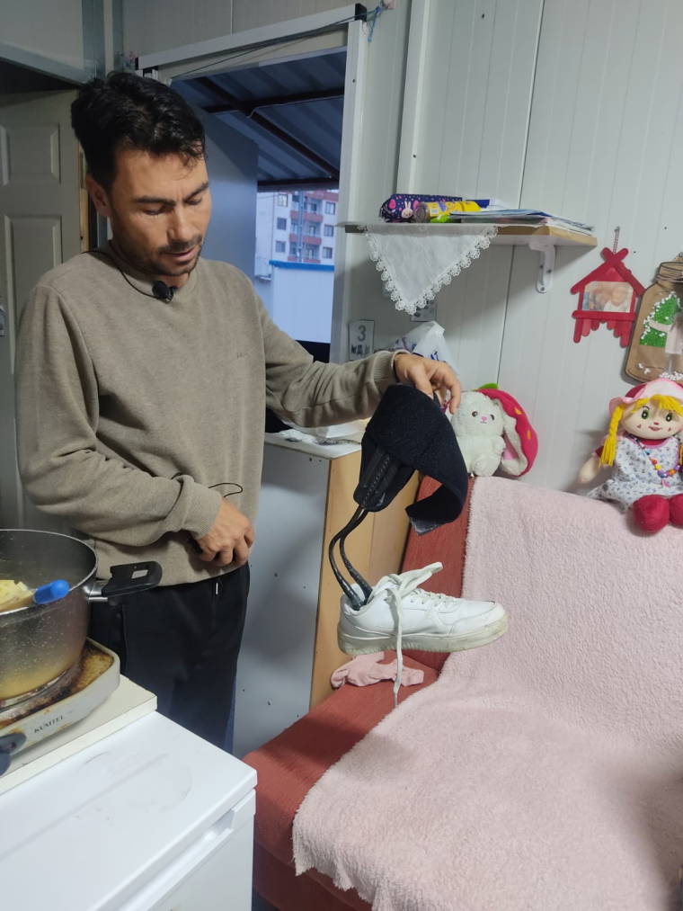 İçeri giriyoruz, yalnızca 35 saniye içerisinde ailenin tamamının enkazda kaldığını, 11 yaşındaki kızlarını kaybettiklerini ve 18 yaşındaki kızlarının ise ayağından operasyon geçirdiğini, destek ile yürüdüğünü öğreniyoruz. Aile yaklaşık 30 bin lira değerindeki aparatı borç harç aldıklarını, hiçbir destek görmediklerini anlatıyor. Sohbet sırasında dört yaşındaki küçük kızları meraklı gözlerle bizi izliyor. Annesinin söyledikleri ise ruhumuza saplanıyor: “İçine kapanık olduğu için yalnızca anne- baba diyebilen kızım, babasının yaralandığını görünce ilk kez enkaz altında cümle kurdu ve ‘Lütfen dayan babacığım’ dedi.”