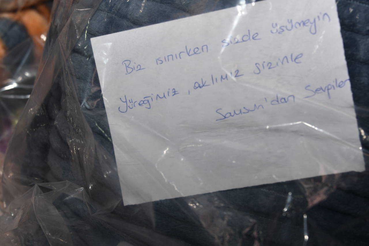 Belediye personeli Semra Uludoğan ise battaniye gönderen yardımseverin pakete yazdığı nottaki, 'Biz ısınırken siz de üşümeyin. Yüreğimiz aklımız sizinle' ifadelerini okurken gözyaşlarını tutamadı.