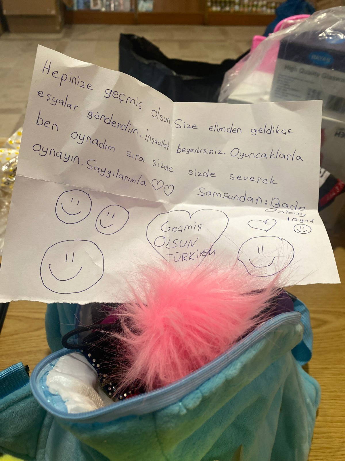 Başka bir notta ise "Canım arkadaşlarım, biz her zaman yanınızdayız. Oyuncaklarımı size yolluyorum. Lütfen ağlamayın, mutlu olun. Ben de sizin bir kardeşinizim. Yatmadan önce size dua ediyorum. Okul harçlıklarımı da size yolluyorum. Sizi çok seviyorum. Hepinize geçmiş olsun. Size elimden geldikçe eşyalar gönderdim. İnşallah beğenirsiniz. Oyuncaklarla ben oynadım sıra sizde. Siz de severek oynayın" ifadeleri yer aldı.