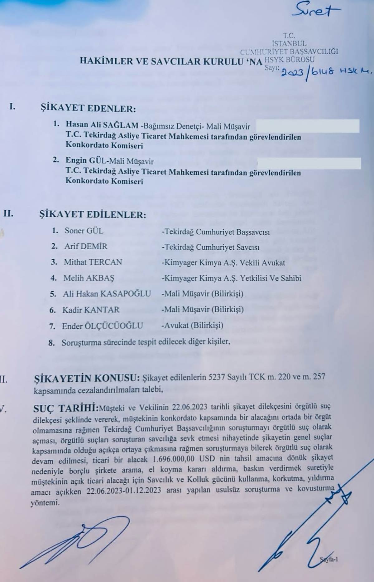 "Yukarıda arz edilen tüm hususlar, Alacaklı Kimyager Kimya Anonim Şirketi’nin 1milyon 696 bin dolar alacağı için tüm bu usule uygun olmayan ve derin şüpheler yaratan hukuksuz ve rutin dışı işlemler dikkate alındığında, şikayete konu edilen Tekirdağ Cumhuriyet Başsavcısı Soner Gül, Cumhuriyet Savcısı Arif Demir (Arif Demir’in Melih Akbaş ve Avukat Mithat Tercan’ın ve bağlı olduğu Tercan Hukuk Bürosundaki tüm Avukat ve çalışanların birbirleriyle olan telefon görüşmeleri), Melih Akbaş, Avukat Mithat Tercan ve bağlı olduğu Tercan Hukuk Bürosundaki Avukat ve çalışanların, Bilirkişi Kadir Kantar, Ali Hakan Kasapoğlu, Avukat Ender Ölçücüoğlu’nun birbirleri veya birinci derecede yakınları arasında banka hesap hareketlerinin incelenmesini, yine bu kişilerin telefon görüşme kayıtları ile HTS ve aynı baz istasyonundan sinyallerinin tespit edilmesi ile aralarındaki varsa ilişkilerin ortaya çıkartılarak komiser heyetimiz hakkında konkordato kapsamındaki bir ticari alacaklının alacağının tahsili için olduğu açıkça belli olan ancak alacak miktarının yaptıkları soruşturma dosyasının da bu kadar hızlı davrandıkları birlikte değerlendirilerek tüm bu kişilerin haklarında detaylı bir soruşturma ve inceleme yapılmasını sayın HSK’dan arz ederiz."
