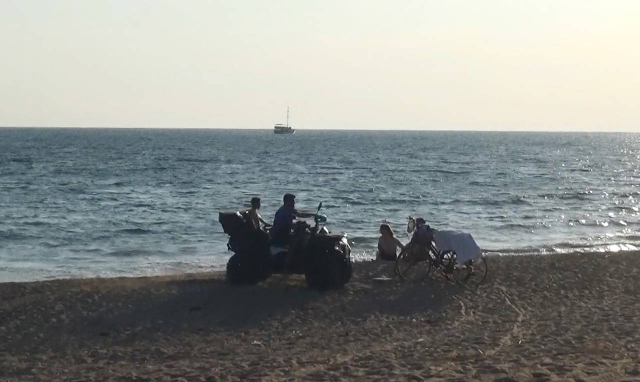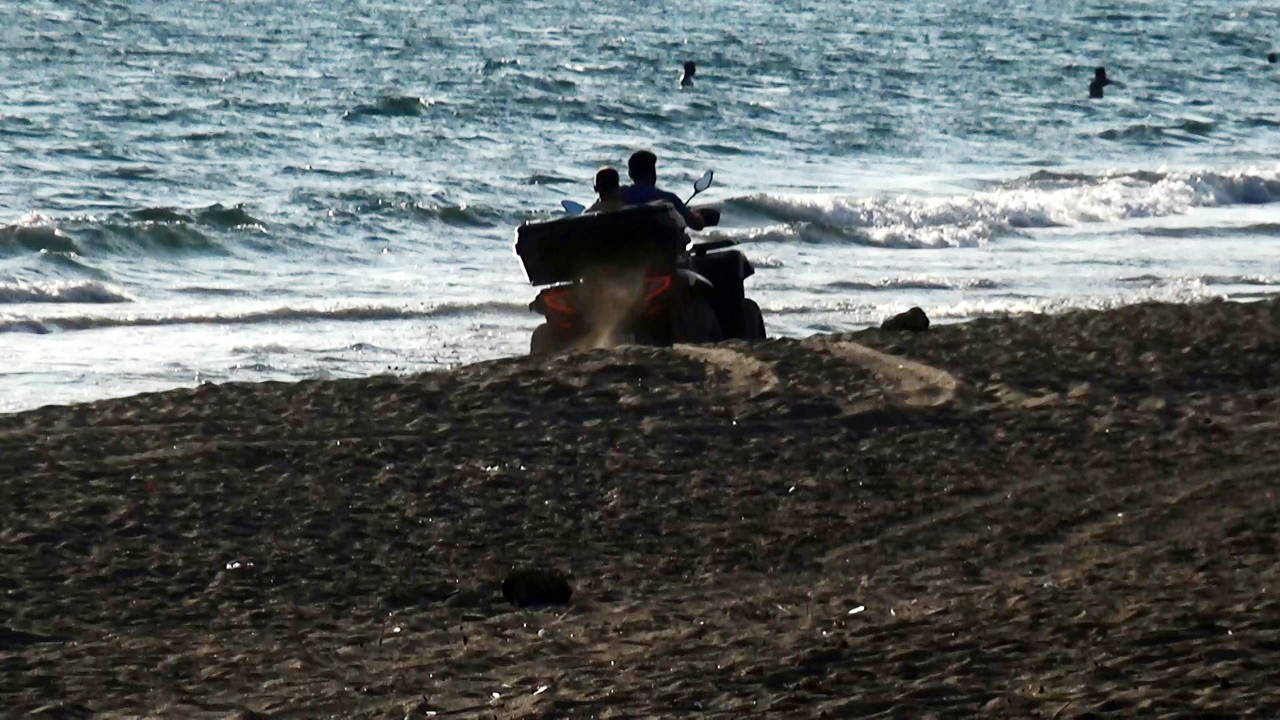 Motorlu araçların özel izinle girdiği, SİT alanı içindeki kumsalda hızla ilerleyerek safari yapan ATV aracındakiler, güneşlenenlerin şaşkın bakışları arasında bir süre gezinti yaptıktan sonra uzaklaştı.