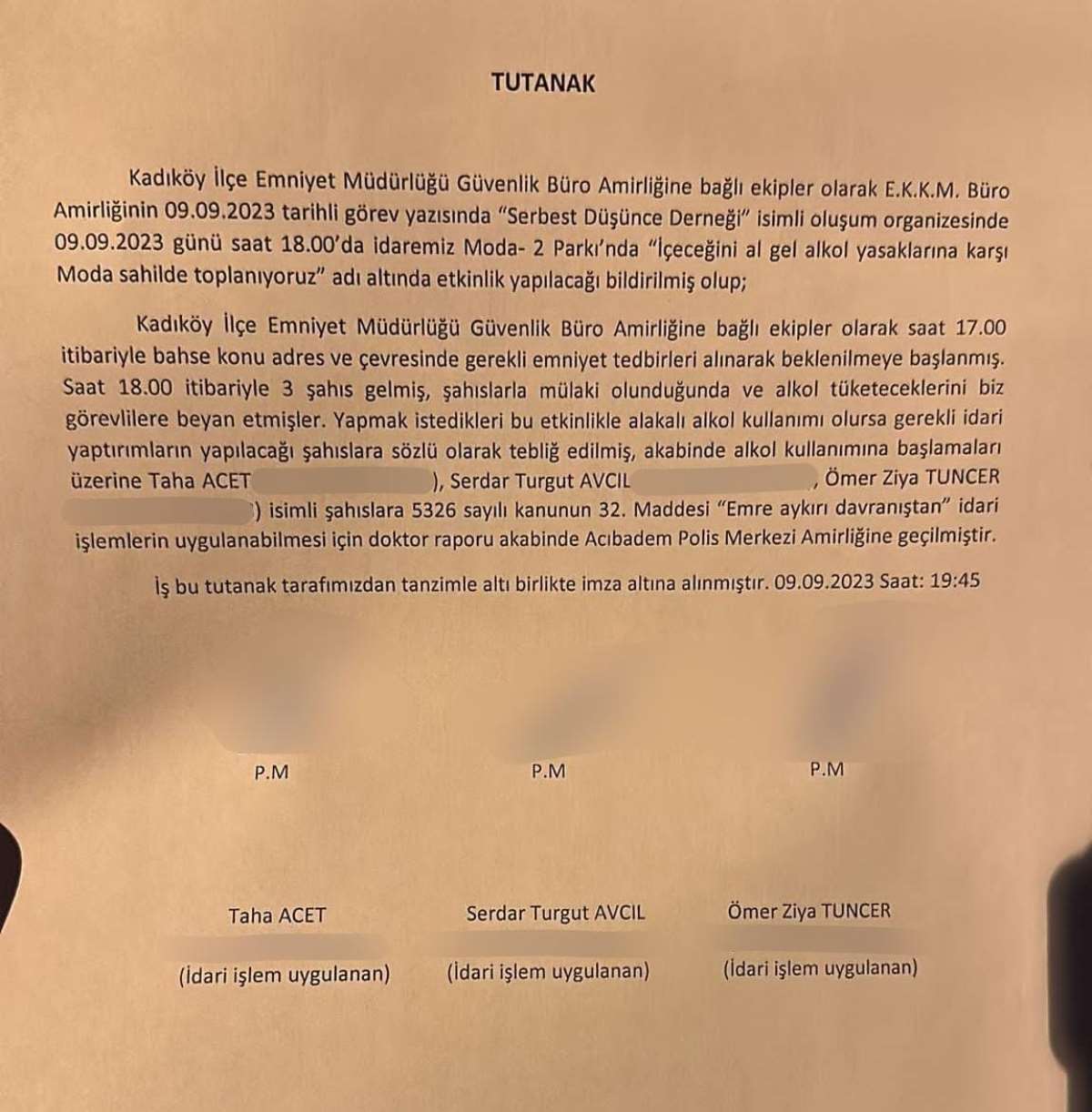 "Bu akşam (09.09.2023) saat 18:00'da, İstanbul Valiliğinin 18.08.2023 tarihli "alkol yasağı" olarak medyada geniş yer bulan ve hukuka açıkça aykırı genelgesine karşı özgürlüklerimizle birlikte haklarımızı korumak için planlanan "İçeceğini Al Gel" etkinliğimiz kapsamında toplandığımız Kadıköy Moda Sahilinde alkol tüketilmesi, kolluk kuvvetlerince engellenmiş ve derneğimizin 3 kurucu üyesine 5326 sayılı Kanunun "emre aykırı davranış" başlıklı 32. maddesi uyarınca idari işlem uygulanmıştır. Yönetim Kurulu Başkanımıza ve diğer kurucu üyelerimize uygulanan kanunsuz emir dayatması ve neticesinde uygulanan idari işlem kabul edilemezdir. Anayasaya, Avrupa İnsan Hakları Sözleşmesine ve Kanuna aykırı olan bu idari işlemle birlikte söz konusu Valilik genelgesine karşı her türlü yasal haklarımızı kullanacağımızı saygılarımızla bildiririz."