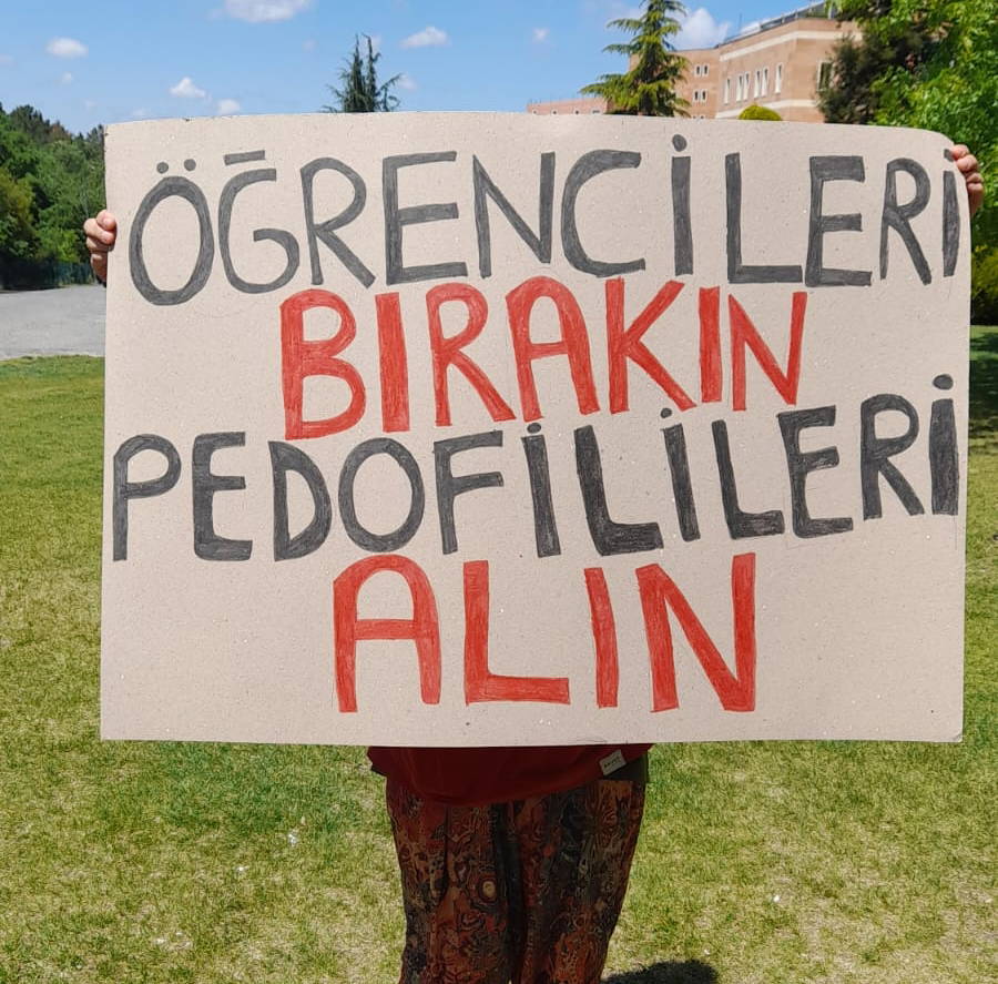 Ellerinde 'Öğrencileri bırakın, pedofilileri alın', 'Şeriata, faşizme geçit yok', 'Kampüslerimizde karanlığa geçit yok' dövizleri taşıyan öğrenciler basın açıklaması yaptı.
