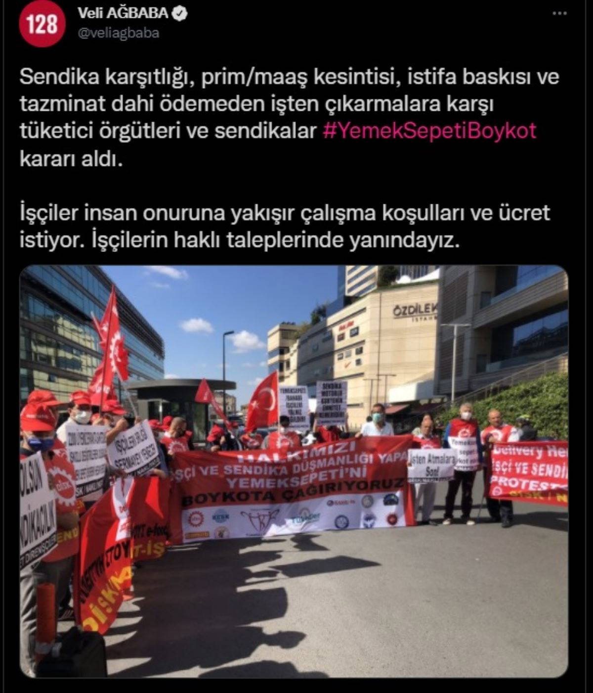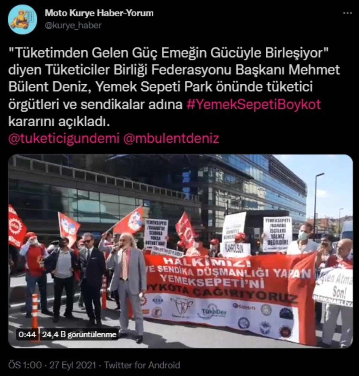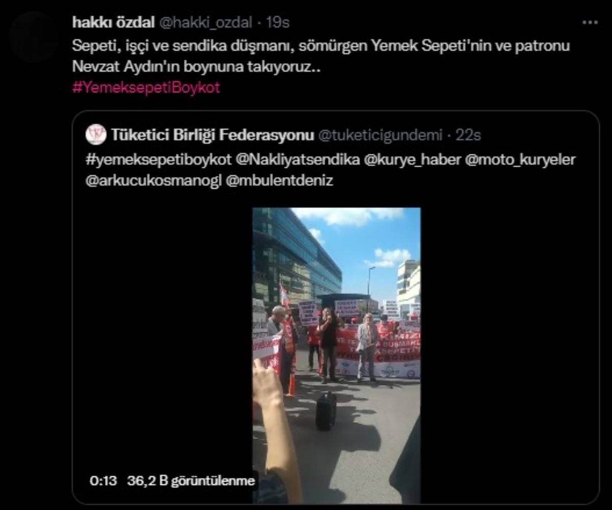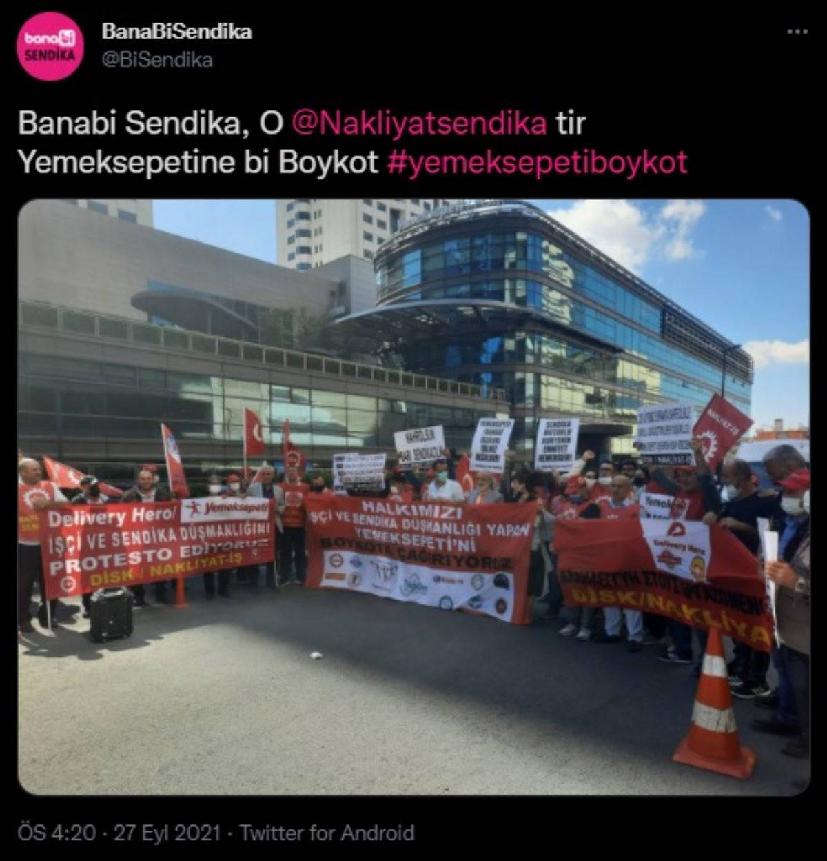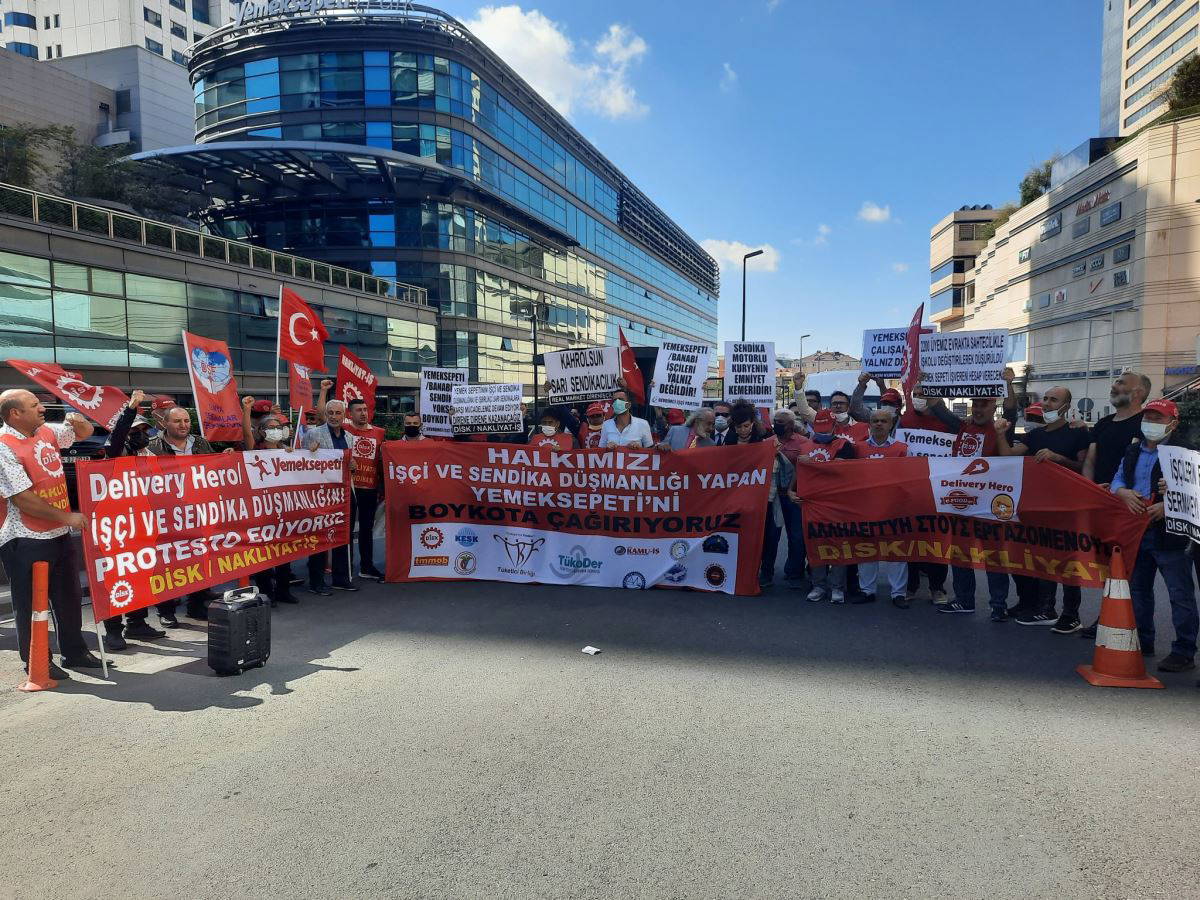 "Hilesepeti olan Yemeksepeti’nin işçi ve sendika düşmanlığını protesto etmek, işçilerin insanca yaşayabilecek bir ücret ve insan onuruna yaraşır çalışma koşulları için mücadelesi ile dayanışmada bulunmak amacıyla 27.09.2021 günü Şişli’de bulunan Yemeksepeti Genel Müdürlüğü önünde 'Yemeksepeti’nden yemek ve market siparişi vermeyelim, boykot edelim, işçi ve sendika düşmanlığına ortak olmayalım' dedik."