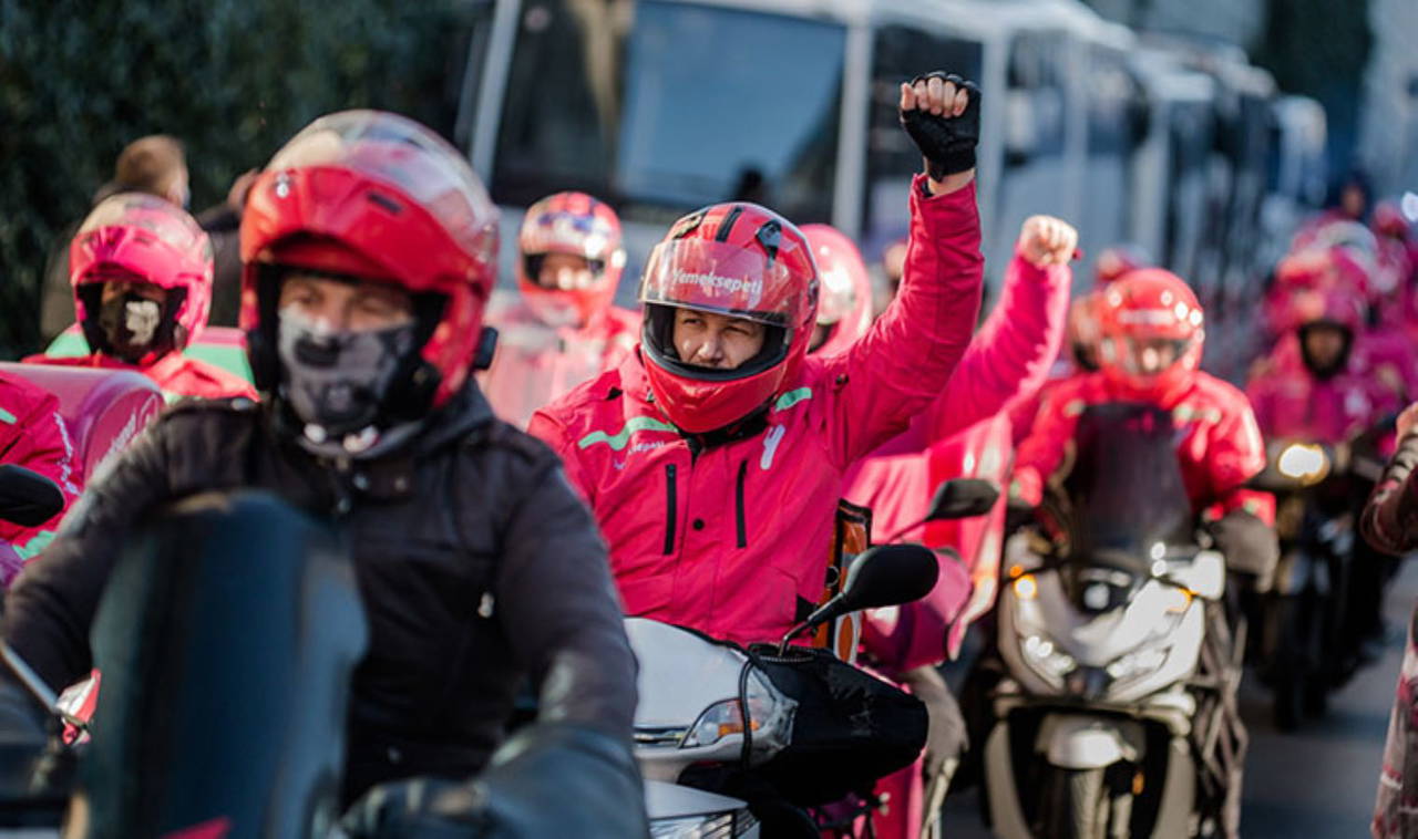 "Direniş Türkiye'nin dört bir yanına yayılmış durumda. İstanbul'da, Ankara'da, İzmir'de, Eskişehir'de, Mersin'de, Denizli'de, Adana'da, Bolu'da, Samsun'da diğer tüm bölgelerde Yemeksepeti’nde çalışan binlerce kişi sefalet ücretine karşı kontak kapatıyor."