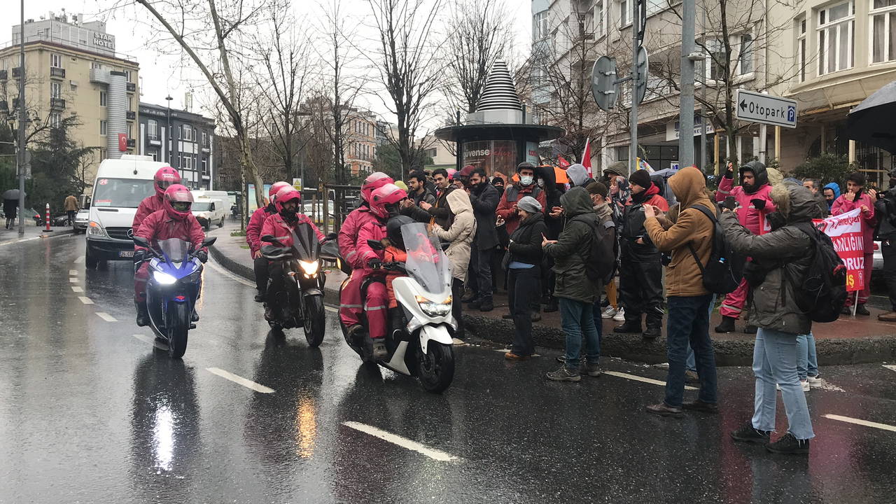 Bugün de Gümüşsuyu'ndaki Almanya Başkonsolosluğu önünde toplanan kuryeler, zam oranlarının yeniden düzenlenmesini talep etti. Haklarının verilmesini isteyen kuryeler, yağmur altında pankart açıp slogan attı.