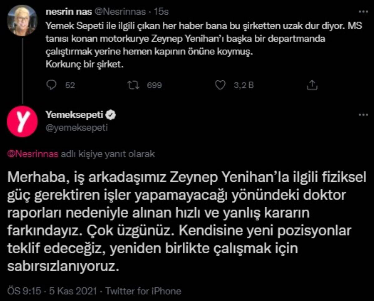 Yemeksepeti, kamuoyunda oluşan tepkilerin ardından yaptığı açıklamada, "Zeynep Yenihan’la ilgili fiziksel güç gerektiren işler yapamayacağı yönündeki doktor raporları nedeniyle alınan hızlı ve yanlış kararın farkındayız. Çok üzgünüz. Kendisine yeni pozisyonlar teklif edeceğiz, yeniden birlikte çalışmak için sabırsızlanıyoruz" ifadelerini kullandı.