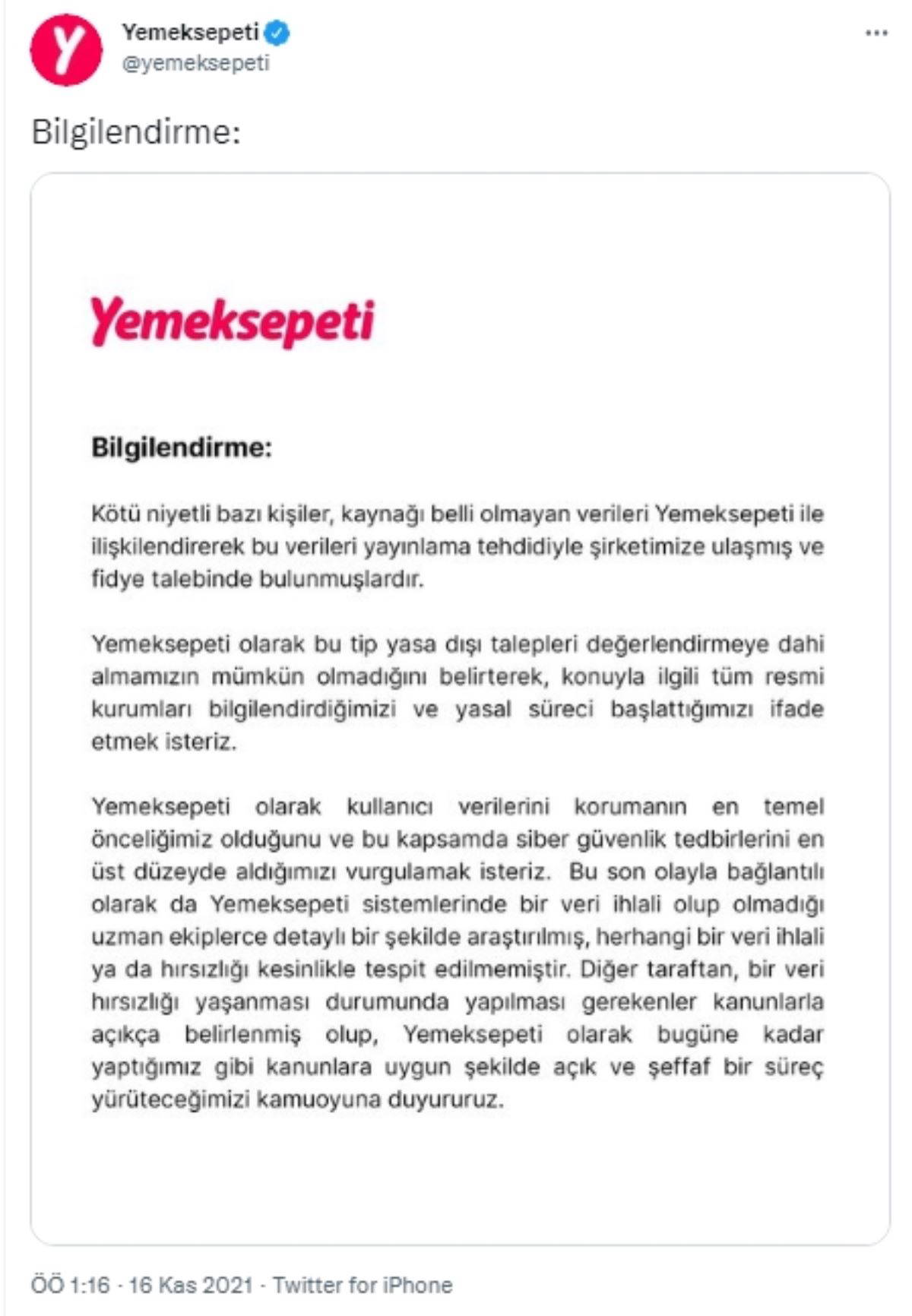 "Yemeksepeti olarak kullanıcı verilerini korumanın en temel önceliğimiz olduğunu ve bu kapsamda siber güvenlik tedbirlerimiz en üst düzeyde aldığımızı vurgulamak isteriz. Bu son olayla bağlantılı olarak da Yemeksepeti sistemlerinde bir veri ihlali olup olmadığı uzman ekiplerce detaylı bir şekilde araştırılmış, herhangi bir veri ihlali ya da hırsızlığı kesinlikle tespit edilmemiştir.