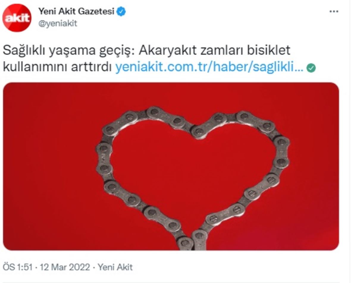 Haberde, “Akaryakıttaki fiyat artışı aracını kullanmak zorunda olanlara içinden çıkılmaz bir hâl alırken, bu durum bisiklet satıcısı esnaflar için ise satışlarda artışa neden oldu. Bisiklet kullanımının artması ise halk sağlığına artı puan kazandırdı” ifadelerini kullanan Yeni Akit, bu paylaşımıyla sosyal medya kullanıcıları tarafından tepki gördü.