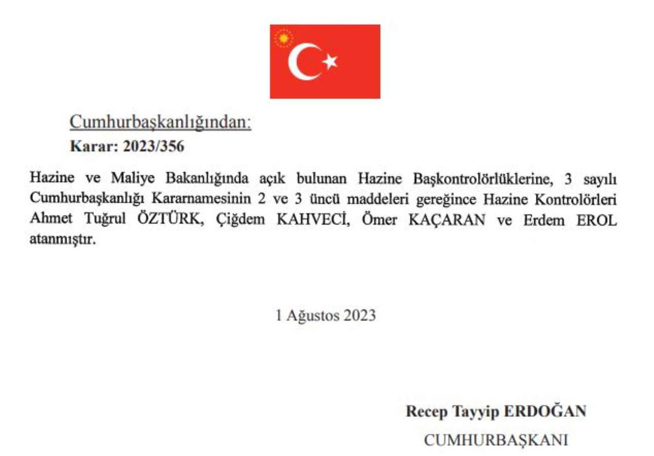 Hazine Başkontrolörlüklerine Ahmet Tuğrul Öztürk, Çiğdem Kahveci, Ömer Kaçaran ve Erdem Erol atandı.