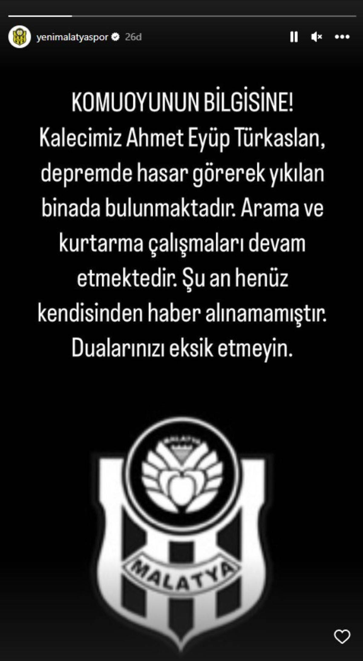 Kulübün resmi sosyal medya hesabından yapılan paylaşımda, "Kalecimiz Ahmet Eyüp Türkaslan, depremde hasar görerek yıkılan binada bulunmaktadır. Arama ve kurtarma çalışmaları devam etmektedir. Şu an henüz kendisinden haber alınamamıştır. Dualarınızı eksik etmeyin" ifadelerini kullandı.