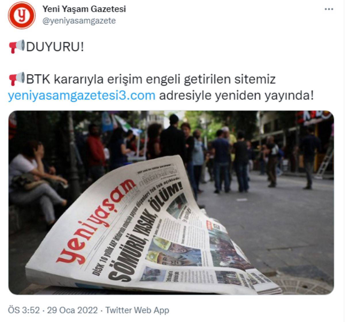 Gazeteden yapılan yeni duyuruda, ''BTK kararıyla erişim engeli getirilen sitemiz 'yeniyasamgazetesi3.com' adresiyle yeniden yayında'' ifadelerine yer verildi.