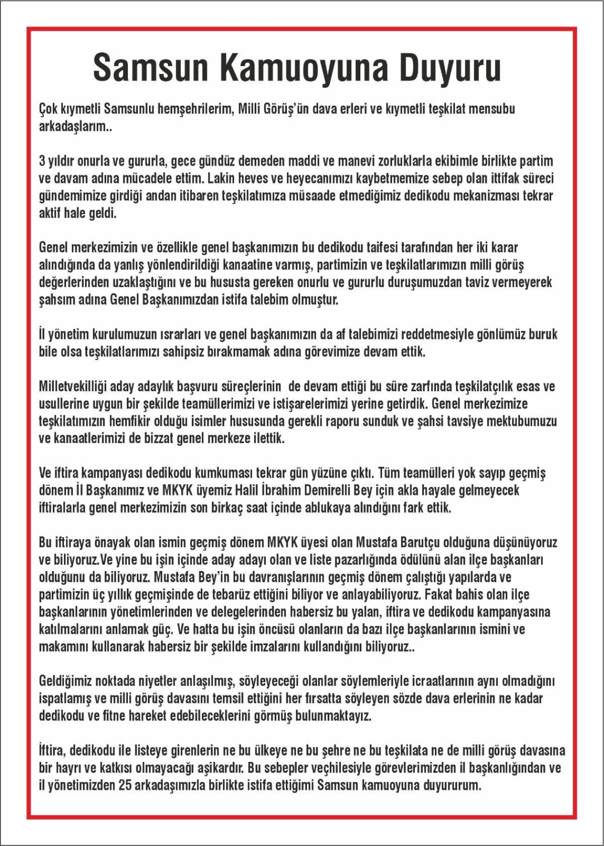 İl Başkanı Salih Şahin toplu istifayı sosyal medya hesabından, “Rahmetli Muhsin Yazıcıoğlu başkanımızın sözüyle bir saniyesine hükmedemediğimiz bir dünya için fırıldak olmaya gerek yok. Onurumuzla, doğrularımızla yüzde 7’ye çok yakınken yalanla dolanla olmayacak bir meçhule gidemeyiz, gitmeyeceğiz. Tüm Samsun’lu hemşerilerime ve bizi seven bizim için buraya gelen emek veren imza veren yanımızda olan dostlarımıza duyulur. Hakkınızı helal edin” sözleriyle duyurdu.