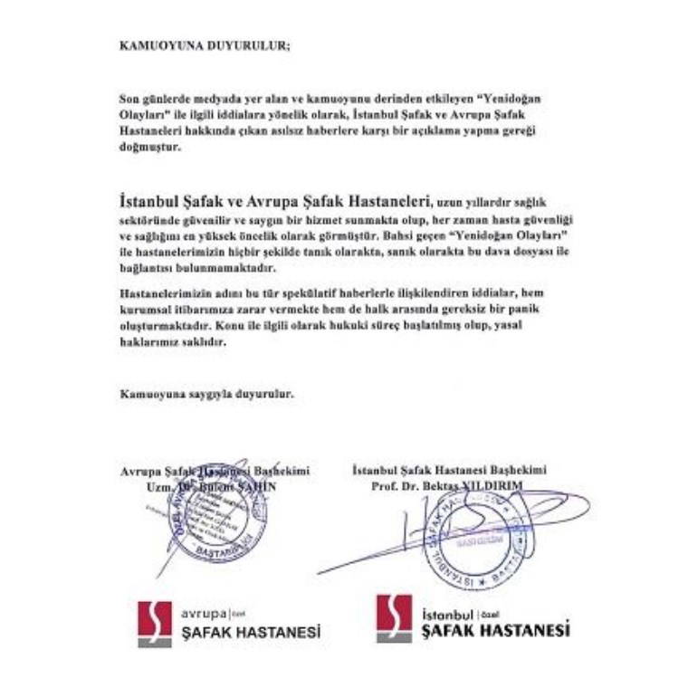 “Son günlerde medyada yer alan ve kamuoyunu derinden etkileyen ‘Yenidoğan Olayları’ ile ilgili iddialara yönelik olarak, İstanbul Şafak ve Avrupa Şafak Hastaneleri hakkında çıkan asılsız haberlere karşı bir açıklama yapma gereği doğmuştur. İstanbul Şafak ve Avrupa Şafak Hastaneleri, uzun yıllardır sağlık sektöründe güvenilir ve saygın bir hizmet sunmakta olup, her zaman hasta güvenliği ve sağlığını en yüksek öncelik olarak görmüştür. Bahsi geçen ‘yenidoğan olayları’ ile ilgili hastanelerimizin hiçbir şekilde tanık olarak da sanık olarak da bu dava dosyası ile bağlantısı bulunmamaktadır. Hastanelerimizin adını bu tür spekülatif haberlerle ilişkilendirilen iddialar hem kurumsal itibarımıza zarar vermekte hem de halk arasında gereksiz bir panik oluşturmaktadır. Konu ile ilgili olarak hukuki süreç başlatılmış olup, yasal haklarımız saklıdır. Kamuoyuna saygıyla duyurulur.”