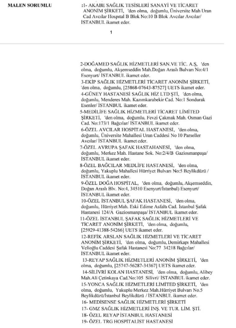 İddianamede bahsi geçen hastaneler şu şekilde sıralanıyor:
