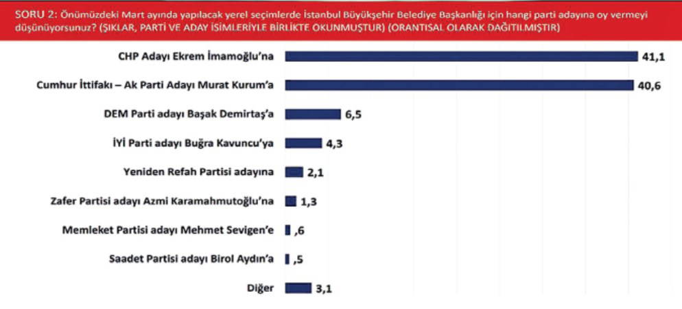 Katılımcılara "Önümüzdeki Mart ayında yapılacak yerel seçimlerde İstanbul Büyükşehir Belediye Başkanlığı için hangi parti adayına oy vermeyi düşünüyorsunuz?" sorusunun yönetildiği ankette AKP'nin adayı Murat Kurum 40.6 ile İmamoğlu'nun ardından ikinci sırada yer aldı.