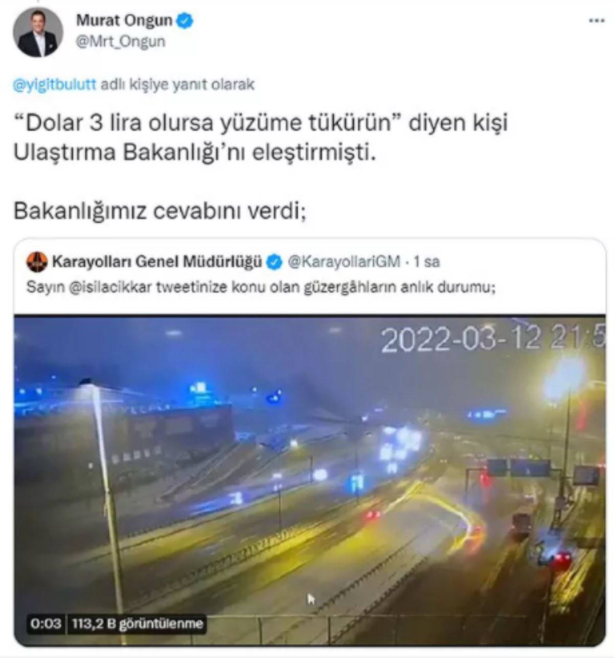 Ongun, bu tweete Karayolları Genel Müdürlüğü'nün paylaşımıyla yanıt verip, "'Dolar 3 lira olursa yüzüme tükürün' diyen kişi Ulaştırma Bakanlığı'nı eleştirmişti. Bakanlığımız cevabını verdi" diye yazdı.