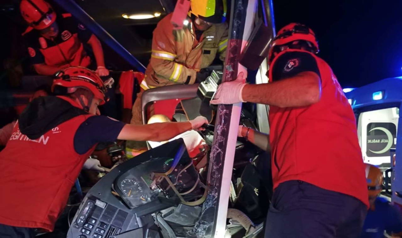 Sürücüler ile otobüsteki muavin, yedek şoför ve 40 yolcunun yaralandığı kaza yerine 112 Acil Sağlık, polis ve jandarma ekipleri sevk edildi.