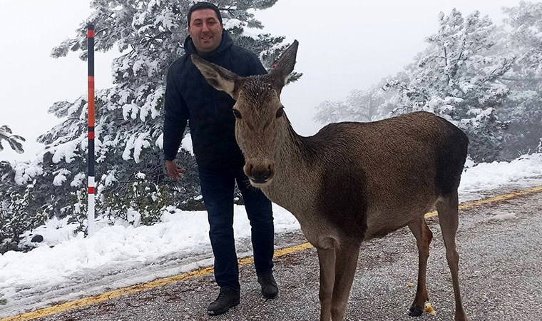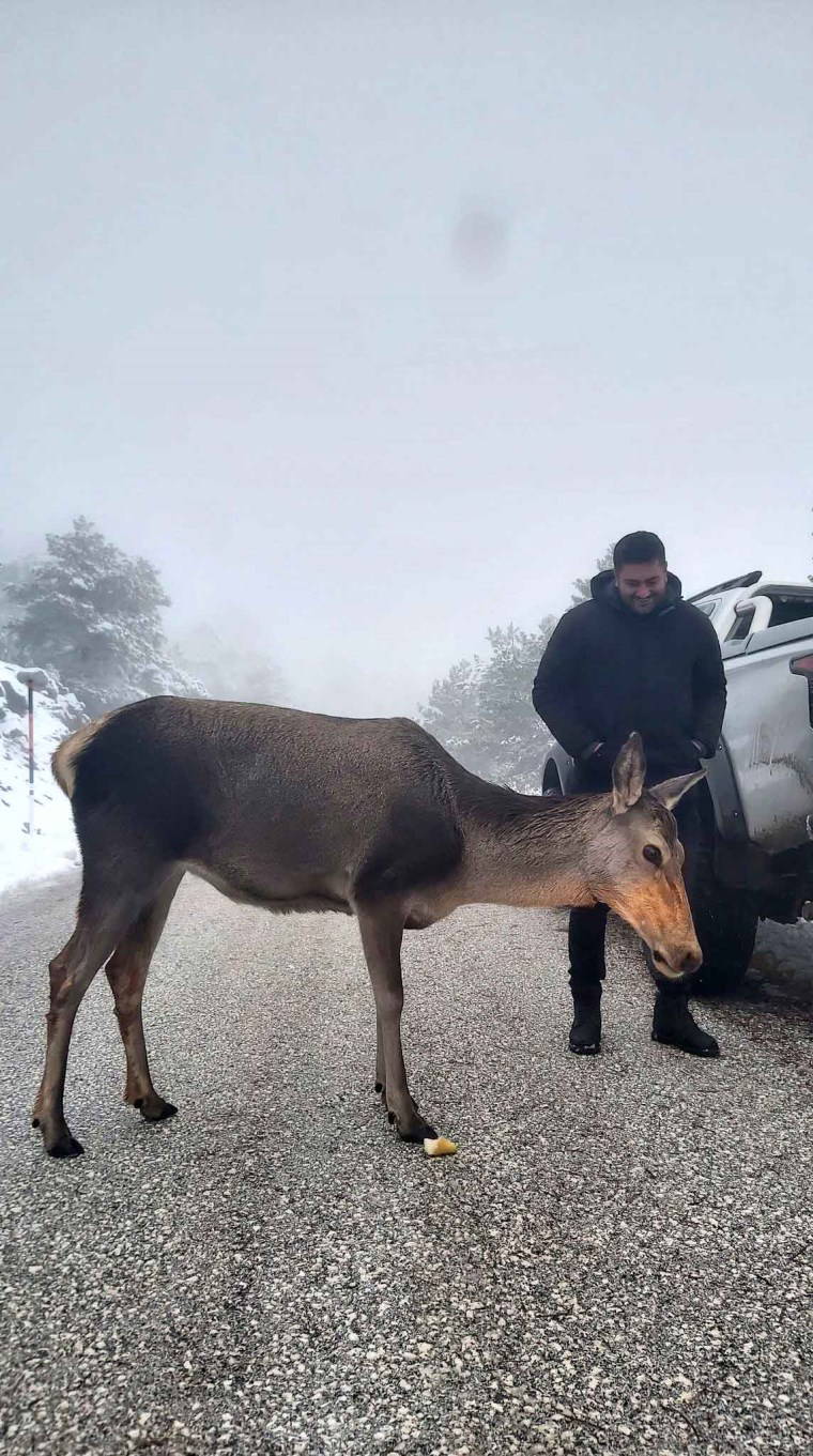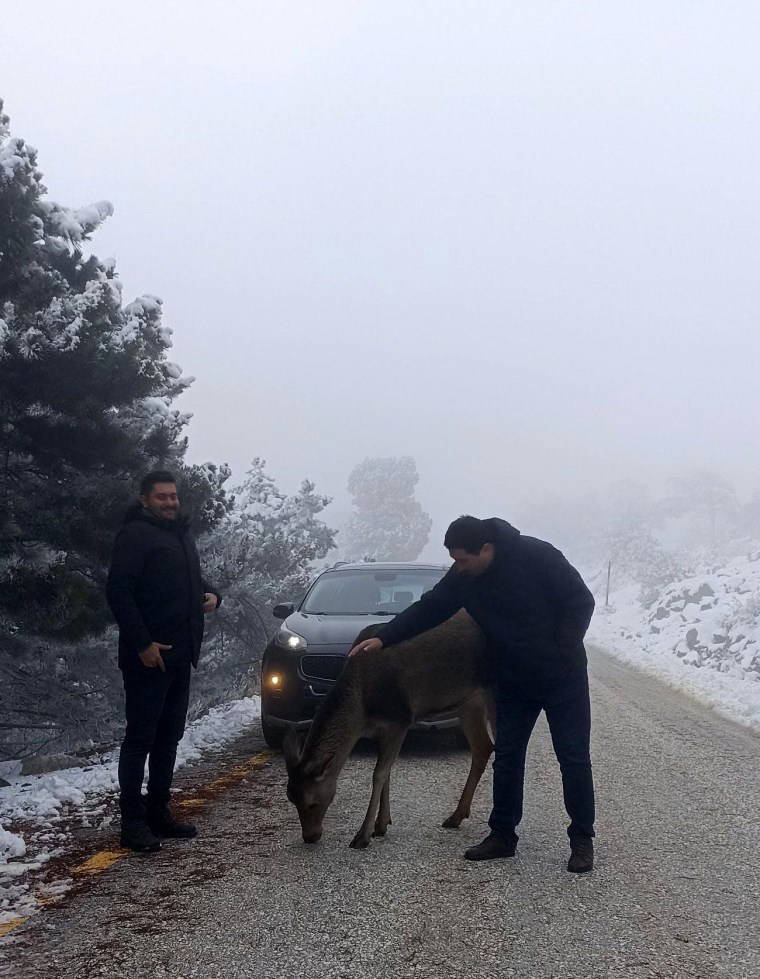 Burdur'daki Salda Kayak Merkezi'ne çıkan bir grup, yolda karşılarına çıkan kızılgeyiği besleyip fotoğraf çekti.