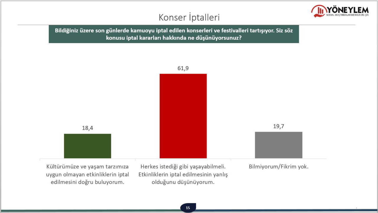 Seçmenlerin yüzde 62'si konser iptallerini yanlış buluyor, "Herkes istediği gibi yaşayabilmeli" diyor. Yüzde 18.4 ise "Kültürümüze ve yaşam tarzıma uygun olmayan etkinliklerin iptal edilmesini doğru buluyorum" görüşünde.