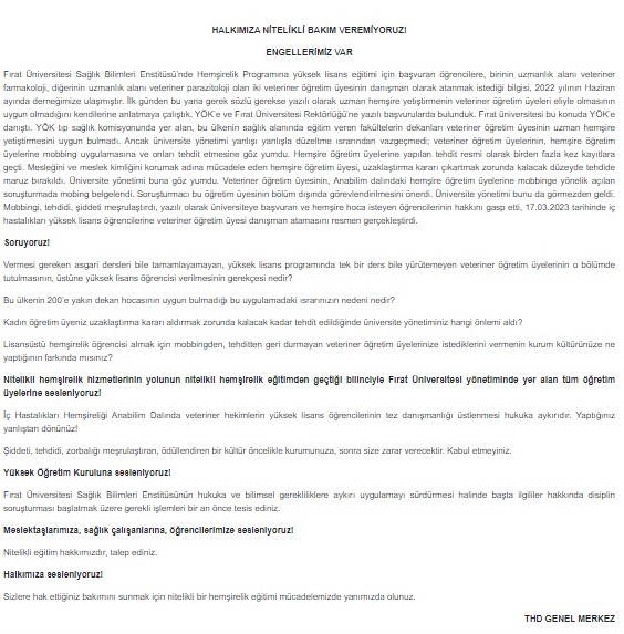"Örneğin kendinizi bir diyabet hastası, ya da kronik böbrek hastası olarak düşünün. Size bakan hemşirenin bir veteriner eliyle uzmanlaştığını, yetiştirildiğini fark etseniz siz bu hemşireye ne kadar güvenebilirsiniz? Rektörlüğün yazılı cevabını sabırsızlıkla bekliyoruz. Çünkü biz de Türk Hemşireler Derneği olarak YÖK'e başvurduk, üniversitedeki bu uygulamanın soruşturulması gerektiği konusunda talebimizi ilettik. Bilimin yanında, doğrunun yanında bir karar çıkmazsa, biz Türk Hemşireler Derneği olarak bu olayı yargı sürecine taşıyacağız."