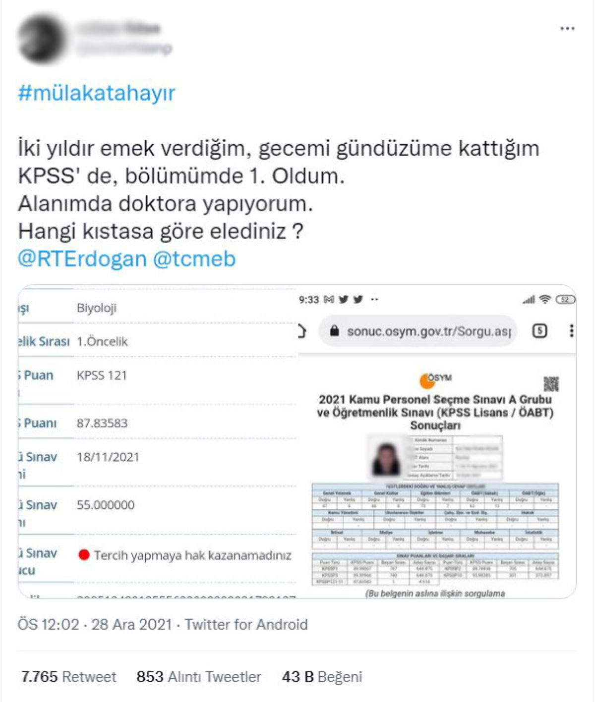 Kamuda çalışmak için KPSS'ye giren ve yüksek puan alıp derece yapan ancak AKP iktidarının düzenlediği mülakatlar sonrası elenen yurttaşlar sert tepki gösterdi.