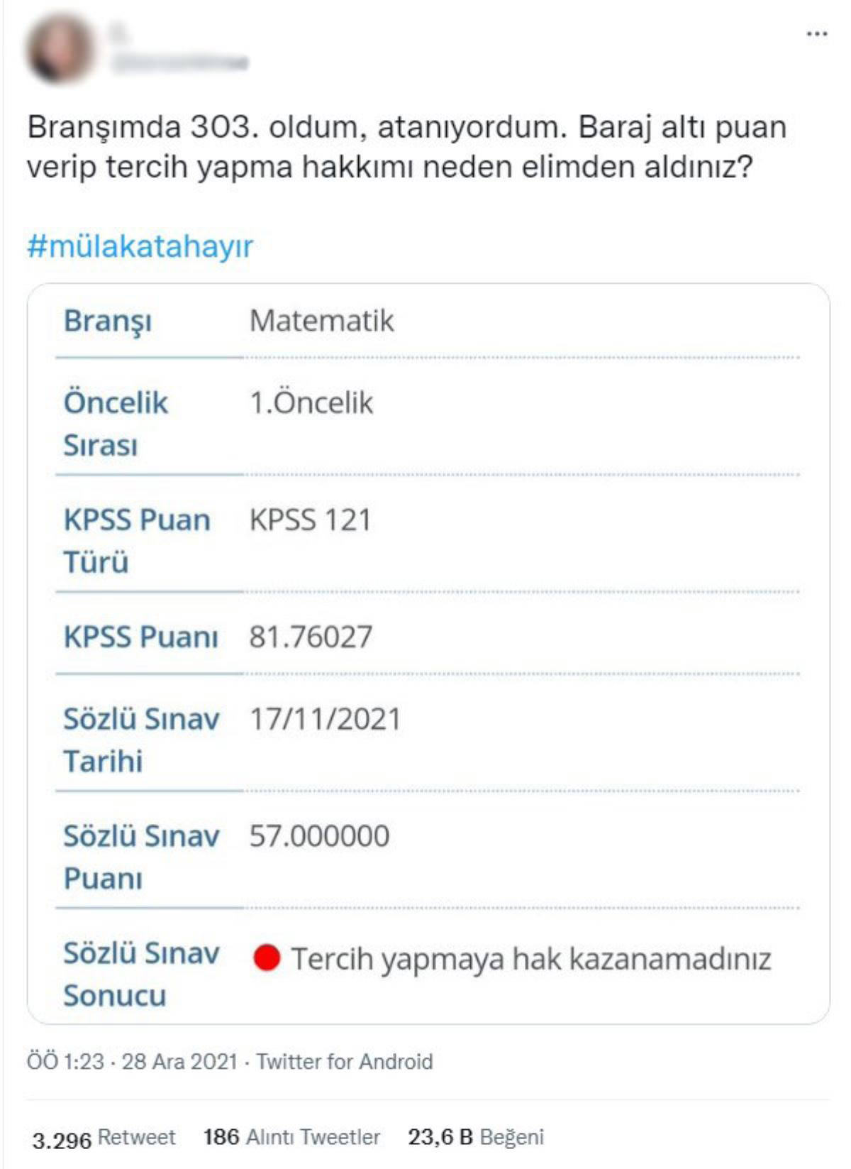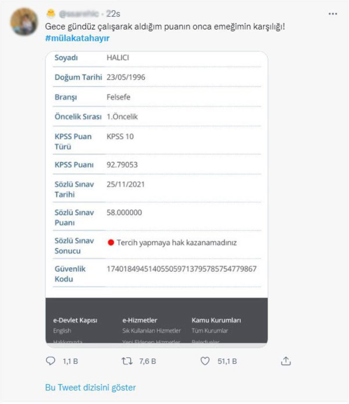 Twitter'da "#mülakatahayır" etiketi ile tepki gösteren yurttaşların paylaşımlarından bazıları şu şekilde: