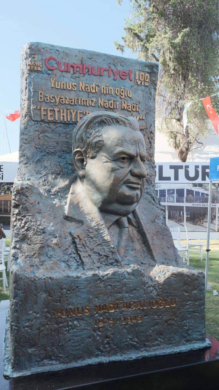 Tören Yunus Nadi Anıtı’na imza atan sanatçı Onur Fırat Fen’in konuşmasıyla başladı. Parkın atıl bir alanken kamuya kazandırıldığına vurgu yapan Fen, “Esere şubat ayında başladık. 45 gün önce anıtımızın yerini tayin ettik. Burası küçük ama şehrin kalbi sayılabilir. Fethiye için önemli ve değerli bir anıt olduğunu düşünüyorum. Cumhuriyet, 100 yılı geride bırakan ve ikinci yüzyıla dahil olmuş, nice gazetecinin yetişmesine sebep olmuş, çizgisinden sapmadan bugünlere kadar gelen bir gazete. 100. yıl ifadesini altın harflerle oraya kazıdık” dedi.