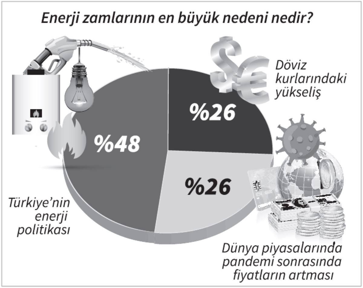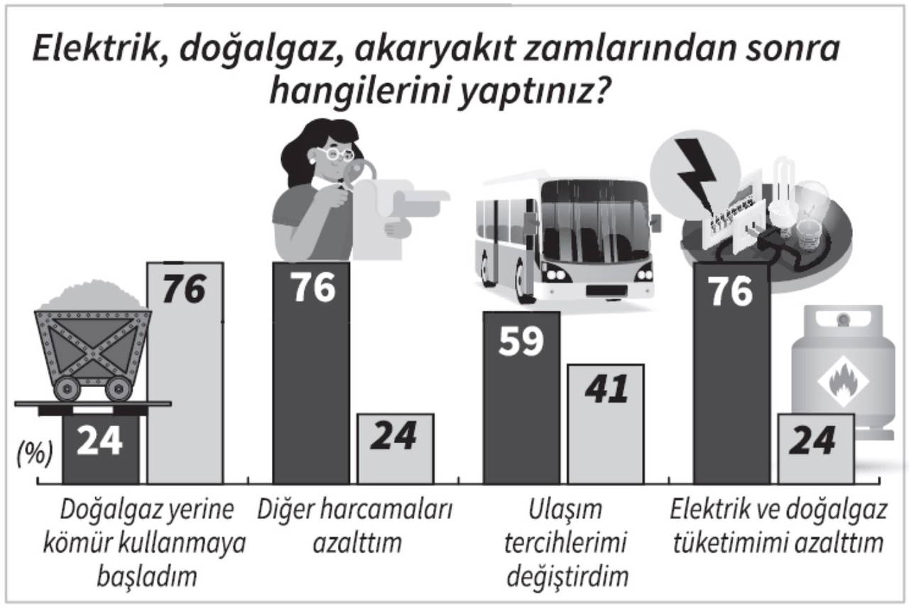 Araştırmaya katılanlara, “Sizce enerji zamlarının en büyük nedeni ne” diye soruldu. Yurttaşların, yüzde 48’i zamların nedenini Türkiye’nin enerji politikasına bağlarken, yüzde 26’sı döviz kurundaki artışı gerekçe olarak gösterdi. Katılımcıların yüzde 26’sı ise “Neden, dünya genelindeki fiyat artışı” dedi. Yurttaşların yüzde 76’sı artan fiyatlar karşısında doğalgaz ve elektrik tüketimlerini azalttıklarını ifade etti. “Diğer harcamalarımı kıstım” diyenlerin oranı da yüzde 76 oldu. Yurttaşların yüzde 59’u ulaşım tercihlerini değiştirdiğini ifade etti.