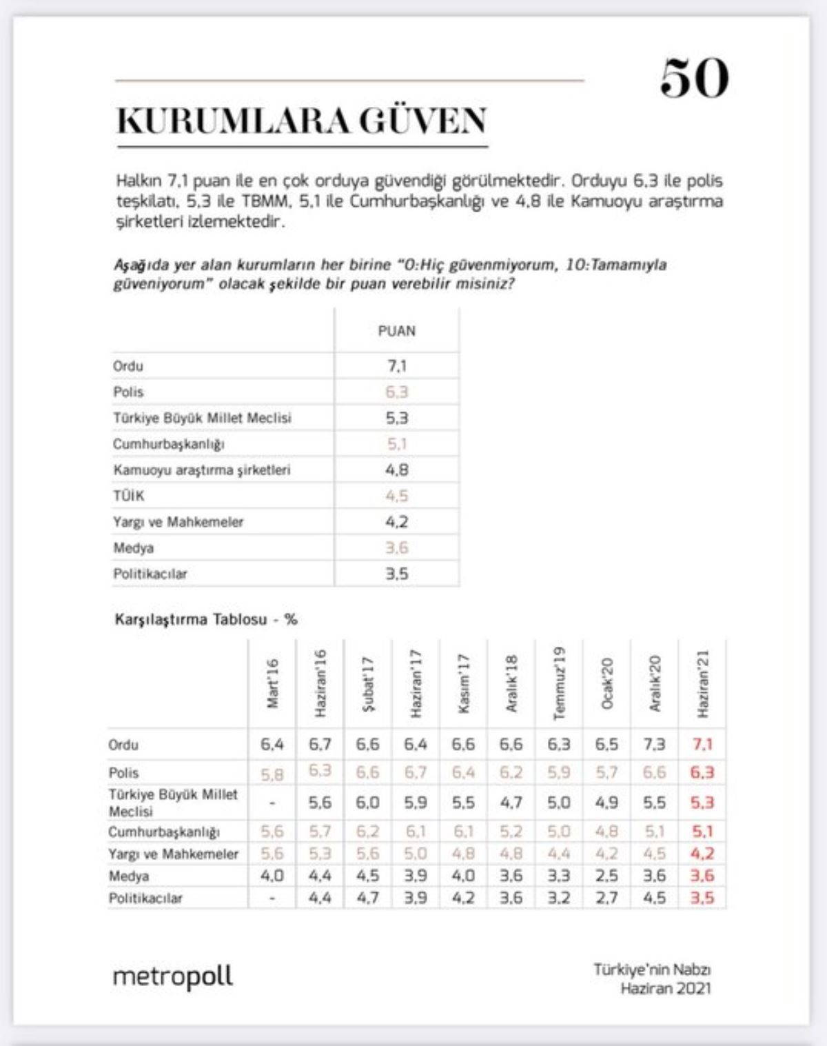 MetroPOLL Araştırma'nın Kurucusu Özer Sencar, 'Kurumlara Güven' anketinin sonucunu sosyal medya hesabından paylaştı.