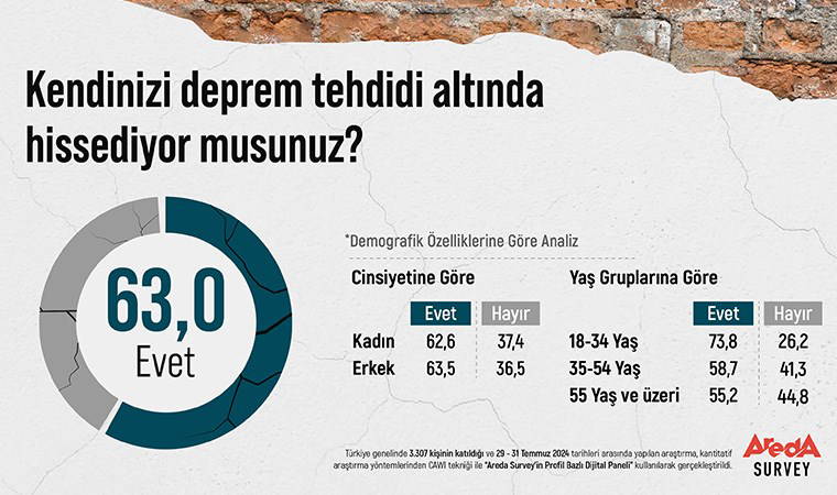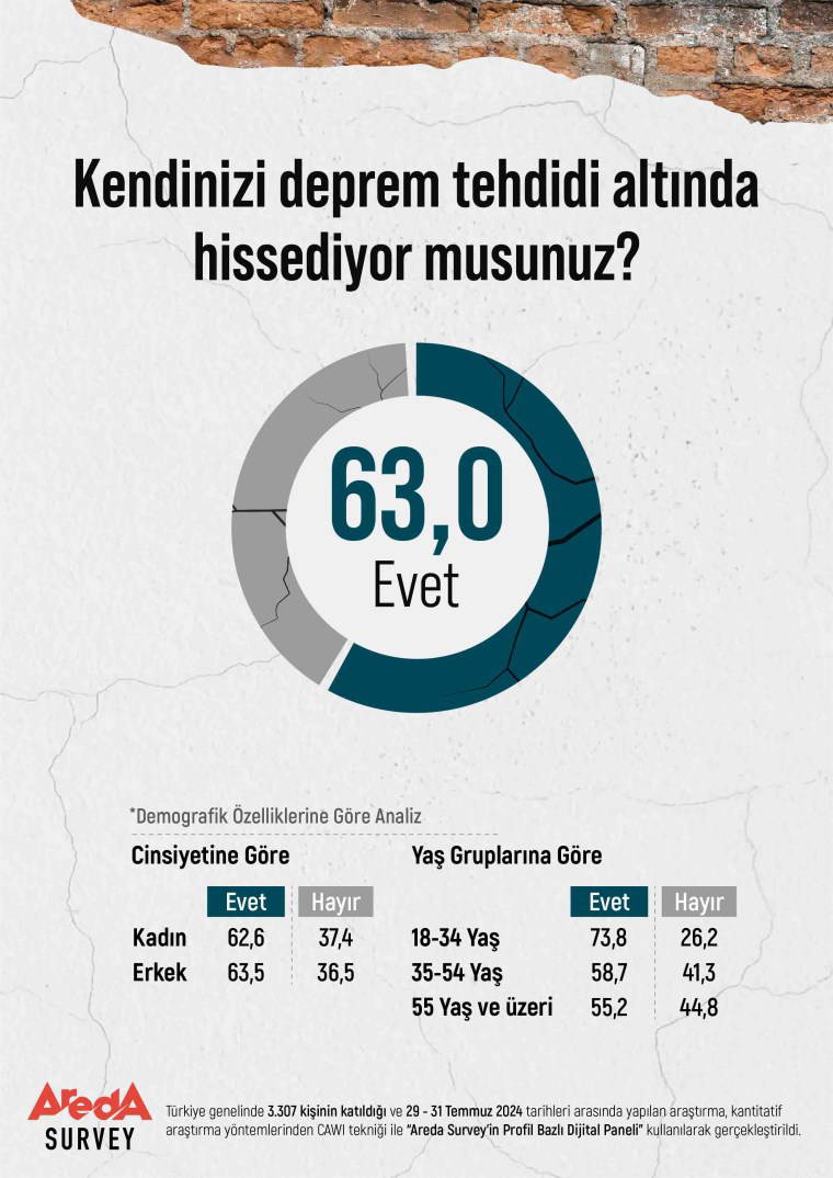 Areda Survey araştırma şirketinin Türkiye genelinde 3 bin 307 kişinin katılımıyla gerçekleştirdiği araştırmaya göre, Türkiye’de yurttaşların yüzde 63’ü kendisini deprem tehdidi altında hissediyor. Depremle ilgili herhangi bir tehdit altında hissetmediğini belirtenlerin oranı ise yüzde 37.