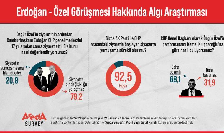 Areda Survey araştırma şirketi, Türkiye genelinde 2 bin 432 kişinin katılımıyla gerçekleştirdiği araştırmaya göre, Türk halkının yüzde 79,2’si AKP'li Cumhurbaşkanı Recep Tayyip Erdoğan’ın 17 yıl sonra CHP Genel Merkezi’ne yaptığı ziyaretin siyasette bir değişikliğe yol açmayacağını ve yüzde 92,5’i de uzun vadede siyaseten bir yumuşamaya sebep olmayacağını düşünüyor. Ayrıca araştırmada CHP Genel Başkanı Özgür Özel’in liderlik performansı da soruluyor ve halkın yüzde 68,1’i, Özel’in liderliğini Kemal Kılıçdaroğlu’ndan daha başarılı buluyor.