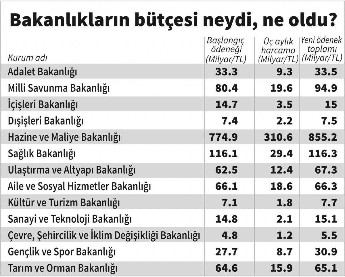 Örneğin, Cumhurbaşkanlığı’na, Bütçe Yasası ile verilen başlangıç ödeneği 3.8 milyar TL’ydi. Üç aylık harcaması 1.1 milyar TL olan Cumhurbaşkanlığı’nın ödenek toplamının 4.2 milyar TL’ye çıkarılması dikkat çekti. Bazı bakanlıkların ödenek toplamı da başlangıç ödeneklerine göre artırıldı. Ödeneği ile birçok bakanlığı geride bırakan Diyanet İşleri Başkanlığı’nın bu yılki bütçesi 16.1 milyar TL’ydi. Üç aylık harcaması 5.1 milyar TL oldu.