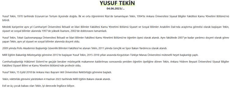 İBB Başkanı Ekrem İmamoğlu'nun danışmanı Murat Ongun, Tekin'in "2006 yılında doçent oldum" sözlerini alıntılayarak, Milli Eğitim Bakanlığı sitesinde yer alan Yusuf Tekin'in özgeçmişinde, Tekin'in 2006 yılında doçent olmadığını paylaştı.