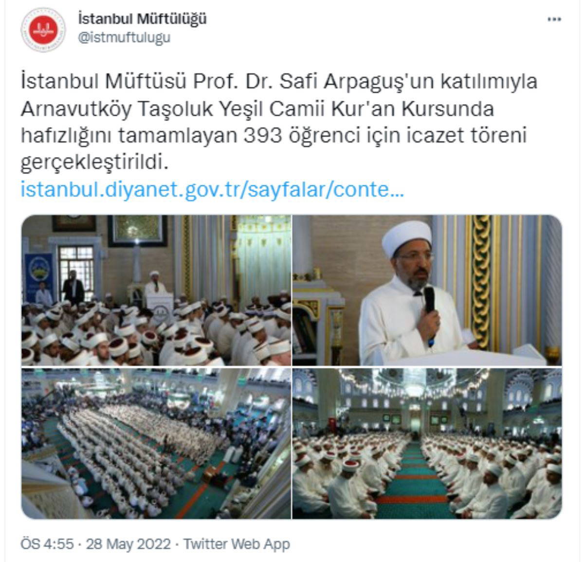 İcazet törenine ilişkin sosyal medya hesabından paylaşım yapan İstanbul Müftülüğü, törene İstanbul Müftüsü Prof. Dr. Safi Arpaguş'un da katıldığını duyurdu.