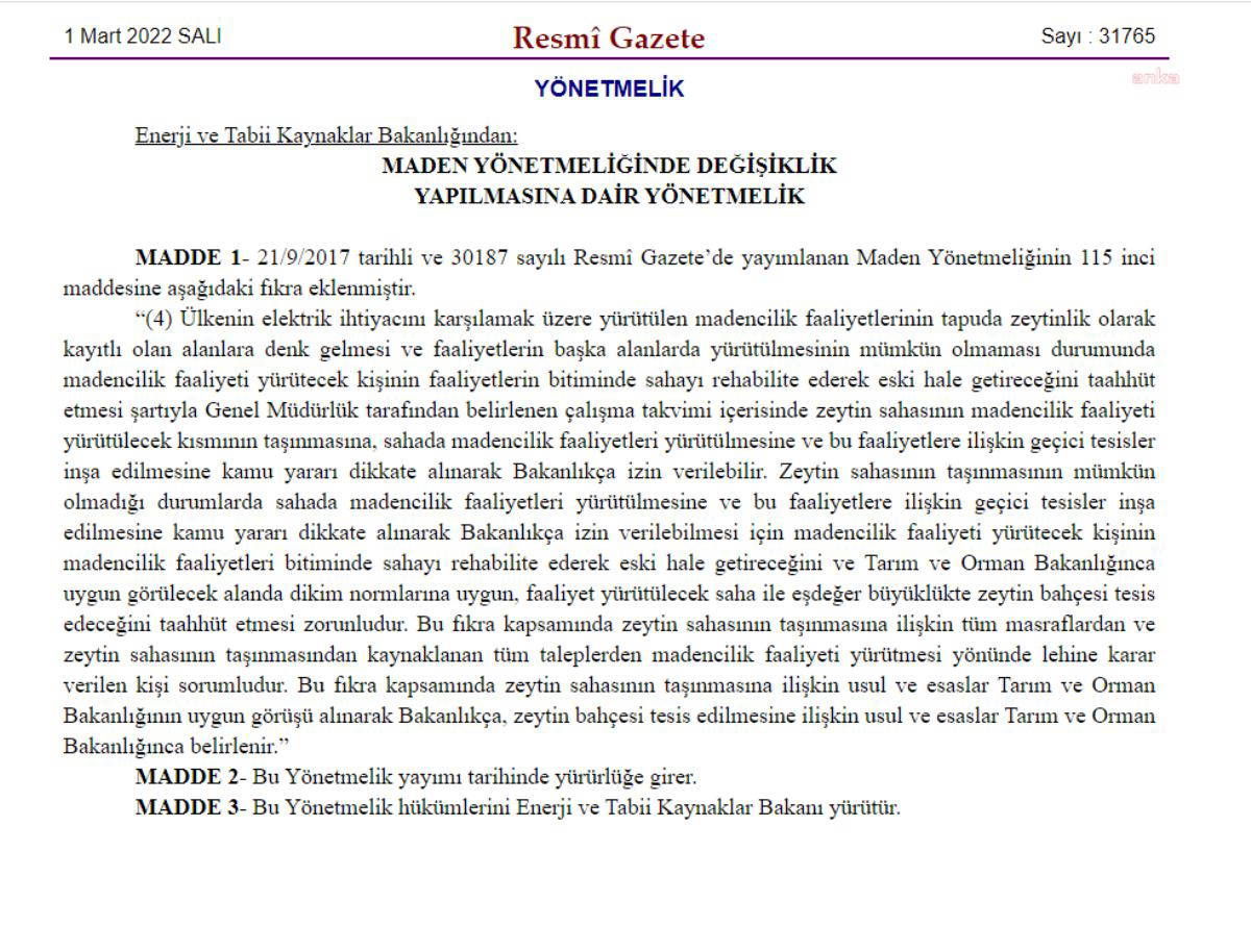 Enerji ve Tabii Kaynaklar Bakanlığı'nın, zeytinliklerin madencilik faaliyetine açılmasına ilişkin yönetmelik değişikliği bugün Resmi Gazete'de yayımlandı. Madencilik Yönetmeliği'nin 115. maddesine eklenen fıkrayla, zeytinlik alanlarında madencilik faaliyetine izin verilmesi, zeytinliklerin taşınması, taşınan ve yok edilen zeytinlik alanı kadar alanın zeytinlik olarak tesis edilmesi hükmü getirildi.