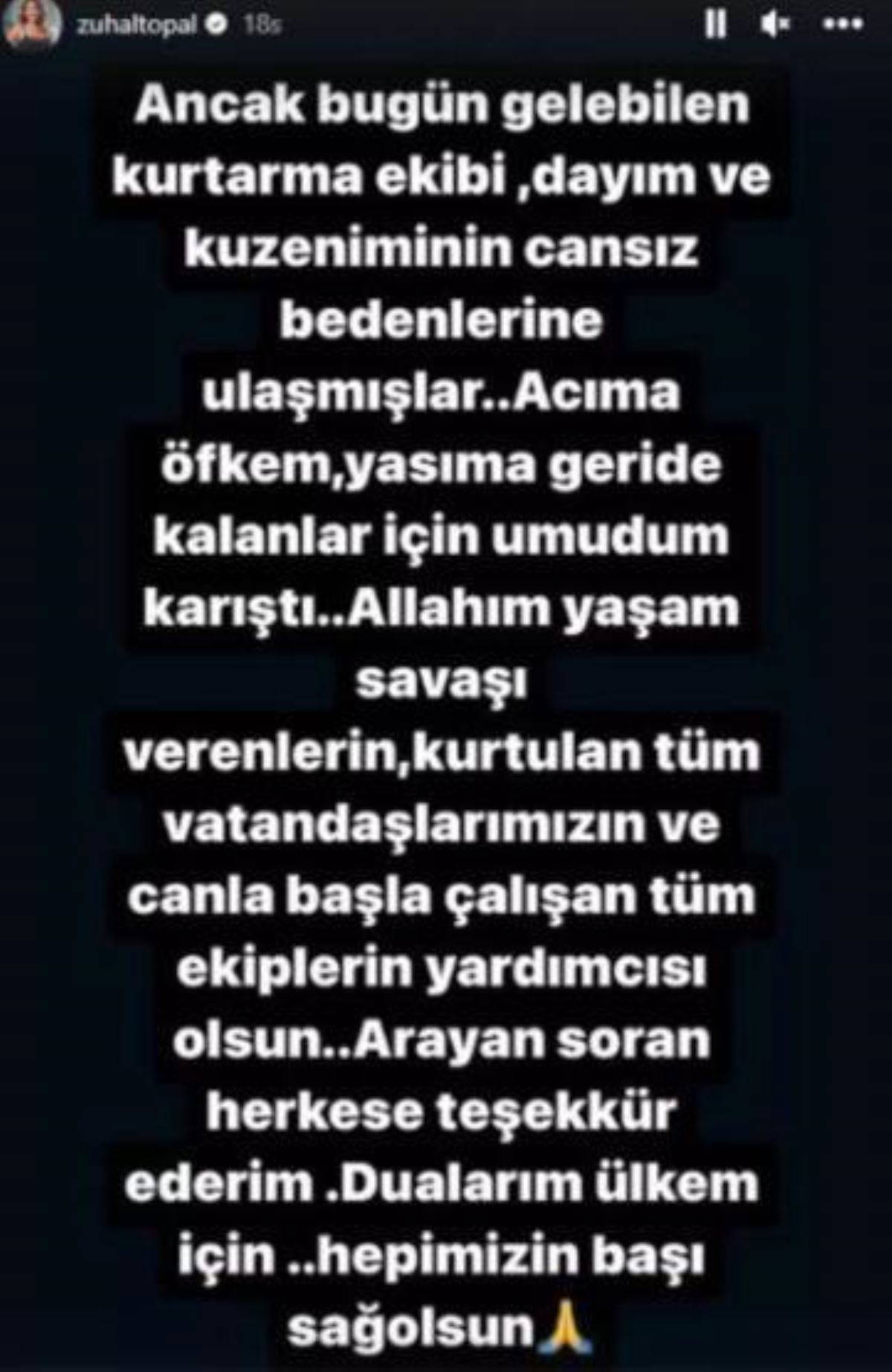 Instagram hesabından dayısı, kuzeni ve arkadaşını kaybettiğini duyuran ünlü sunucu, "Kurtarma ekibi dayım ve kuzenimin cansız bedenlerine ulaştılar. Acıma öfkem, yasıma geride kalanlar için umudum karıştı. Allah'ım yaşam savaşı verenlerini kurtulan tüm vatandaşlarımızın ve canla başla çalışan tüm ekiplerin yardımcısı olsun. Arayan soran herkese teşekkür ederim. Dualarım ülkem için. Hepimizin başı sağ olsun" ifadelerini kullandı.